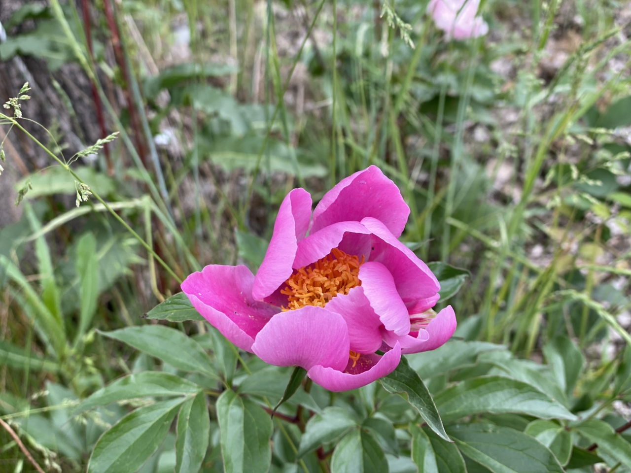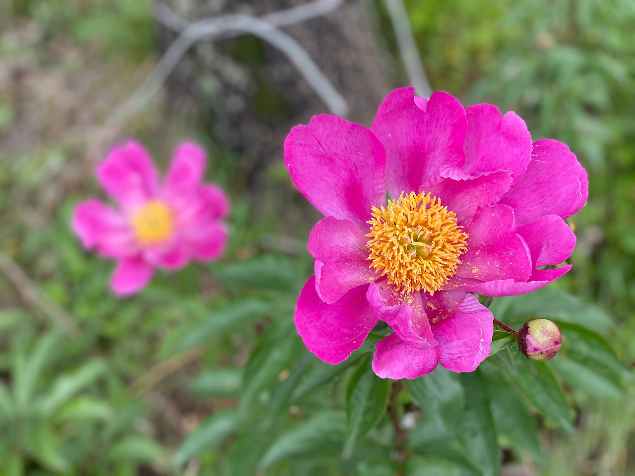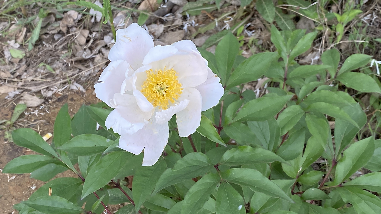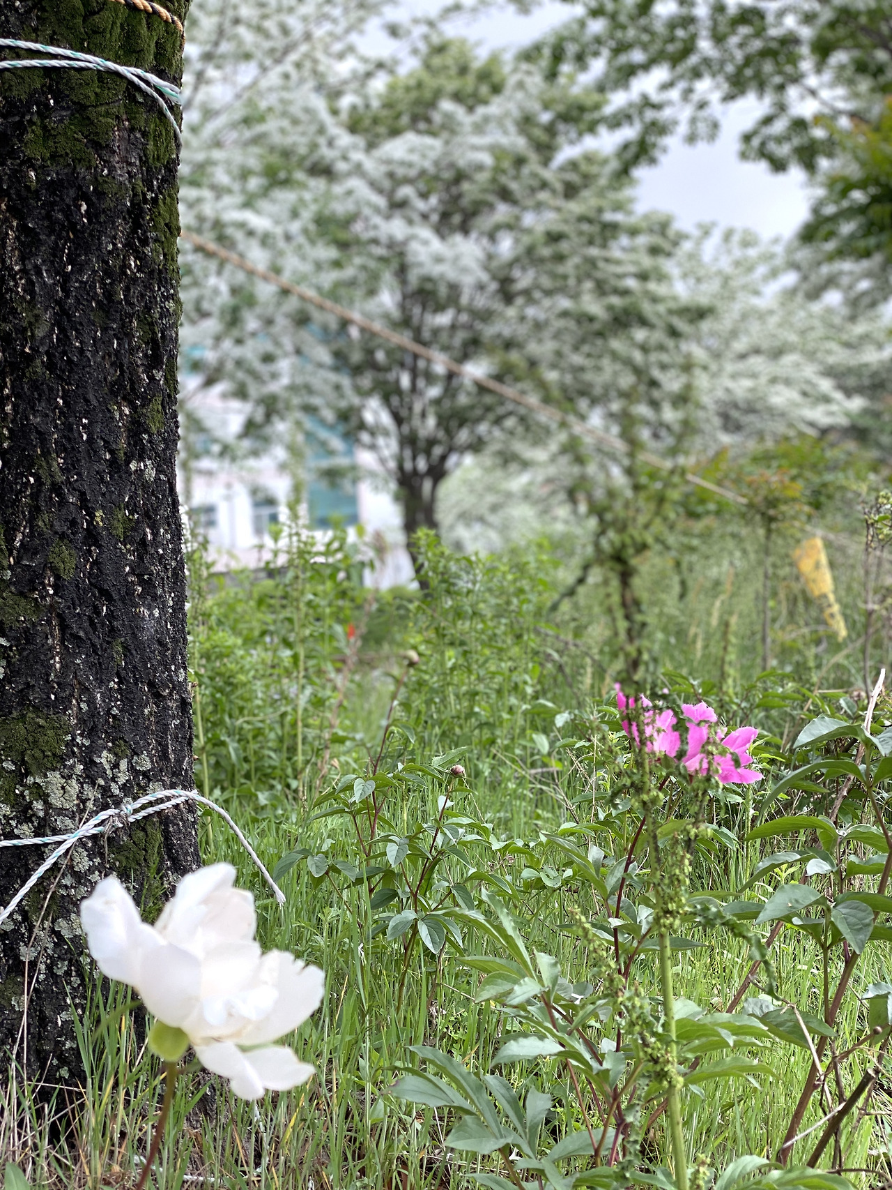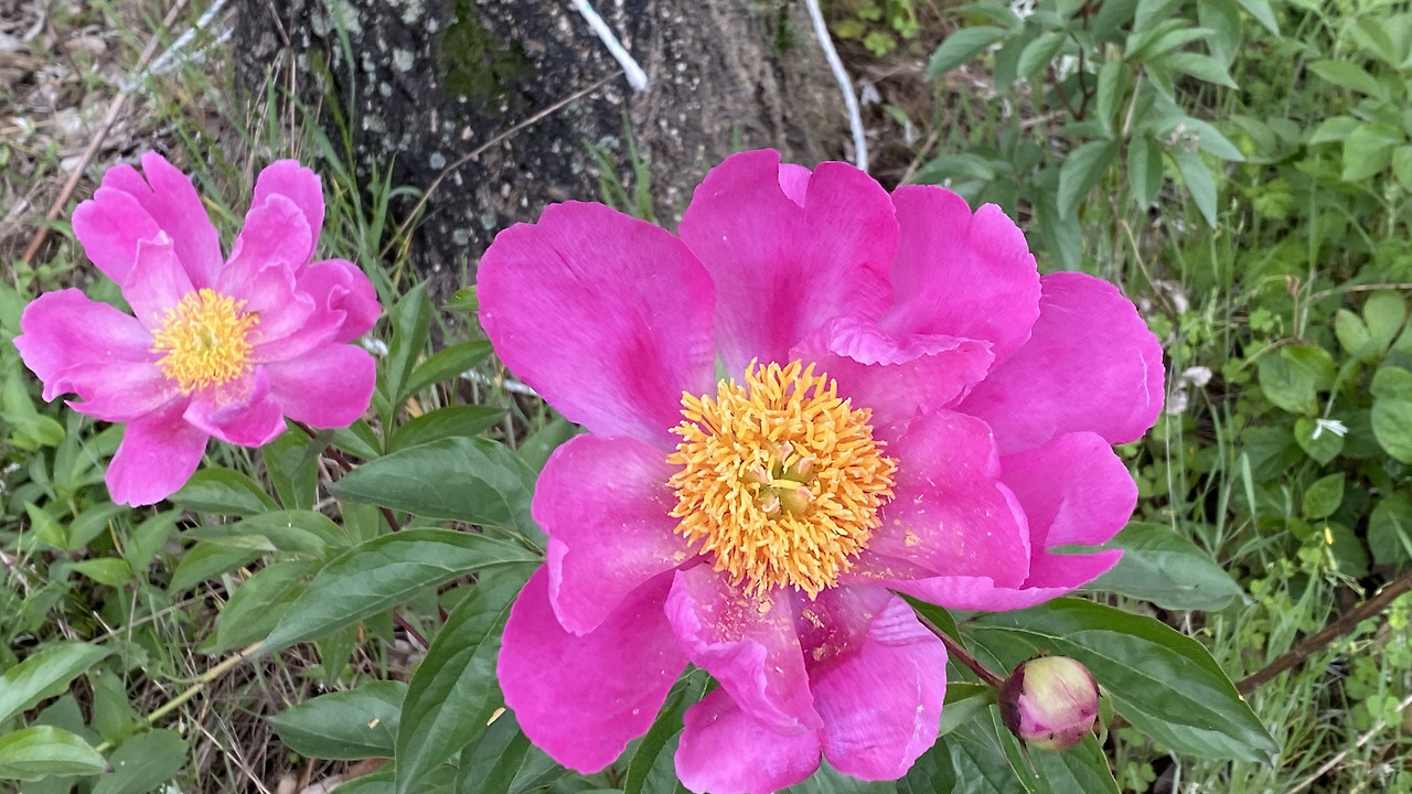 나무 주변에 작약이 활짝 피었다. 작약 꽃말은 '수줍음'이라는데 수줍어하지 않고 화사하다.