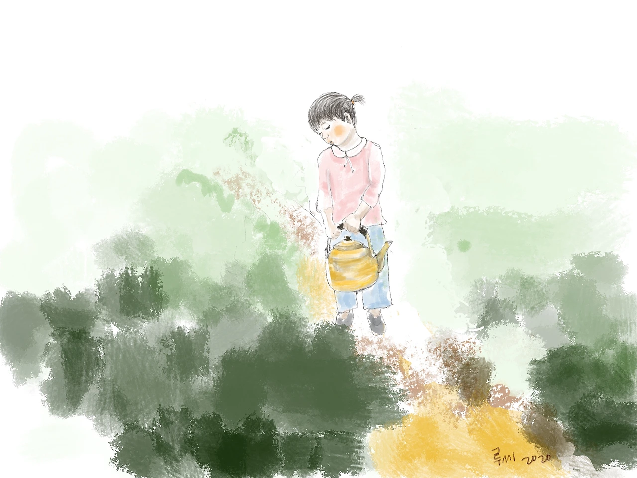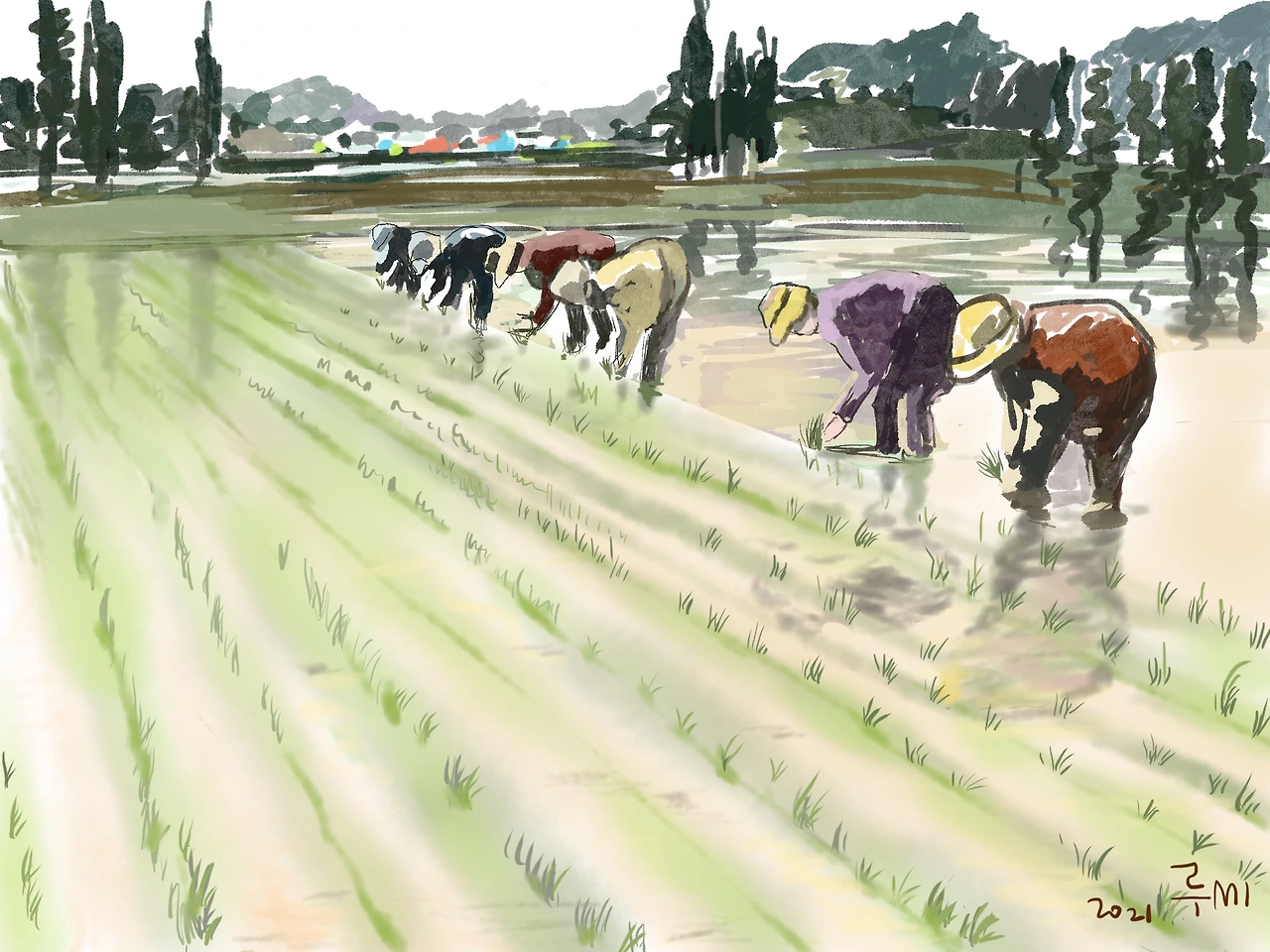 우리 집 모내기는 5월 중순 경에 했다. 아빠가 줄을 맞춰 놓으시면 그 줄을 따라 심는 작업을 우리 가족이 모두 함께 했다. 아주 큰 논은 일꾼들에게 맡기기도 했다. 나는 새참 나갈 때마다 막걸리를 들고 할머니를 따라갔는데 주로 느릿느릿 걸어서 저만치 할머니와 멀어지곤 했다. 막걸리가 흘릴까 봐서 느린 걸음을 할 수밖에 없었다.