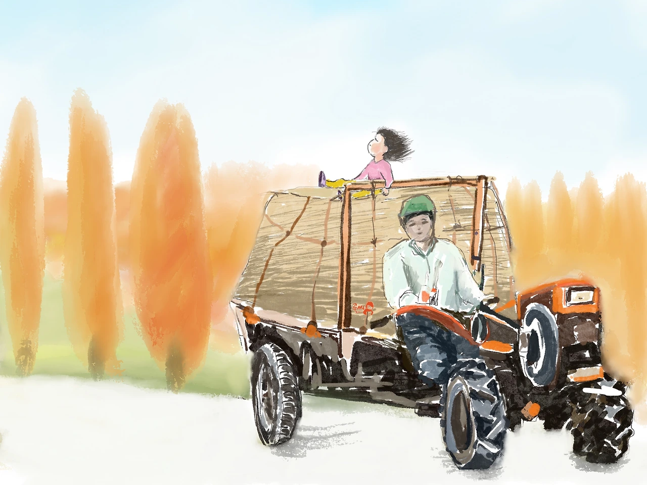 아버지께서 경운기를 이용해 벼 짚단을 나르실 때, 나는 짚단의 맨 위에 앉아서 하늘을 보면서 흥얼거렸다. 그때 나는 참 행복했던 것 같다. 아버지가 경운기를 몰고 계신다는 사실 하나만으로 높은 곳이 무섭지도 않았다. 가을이면 가끔 짚단 위에 앉아 하늘을 보던 그 한 장면이 고정된 스크린처럼 떠 오른다.