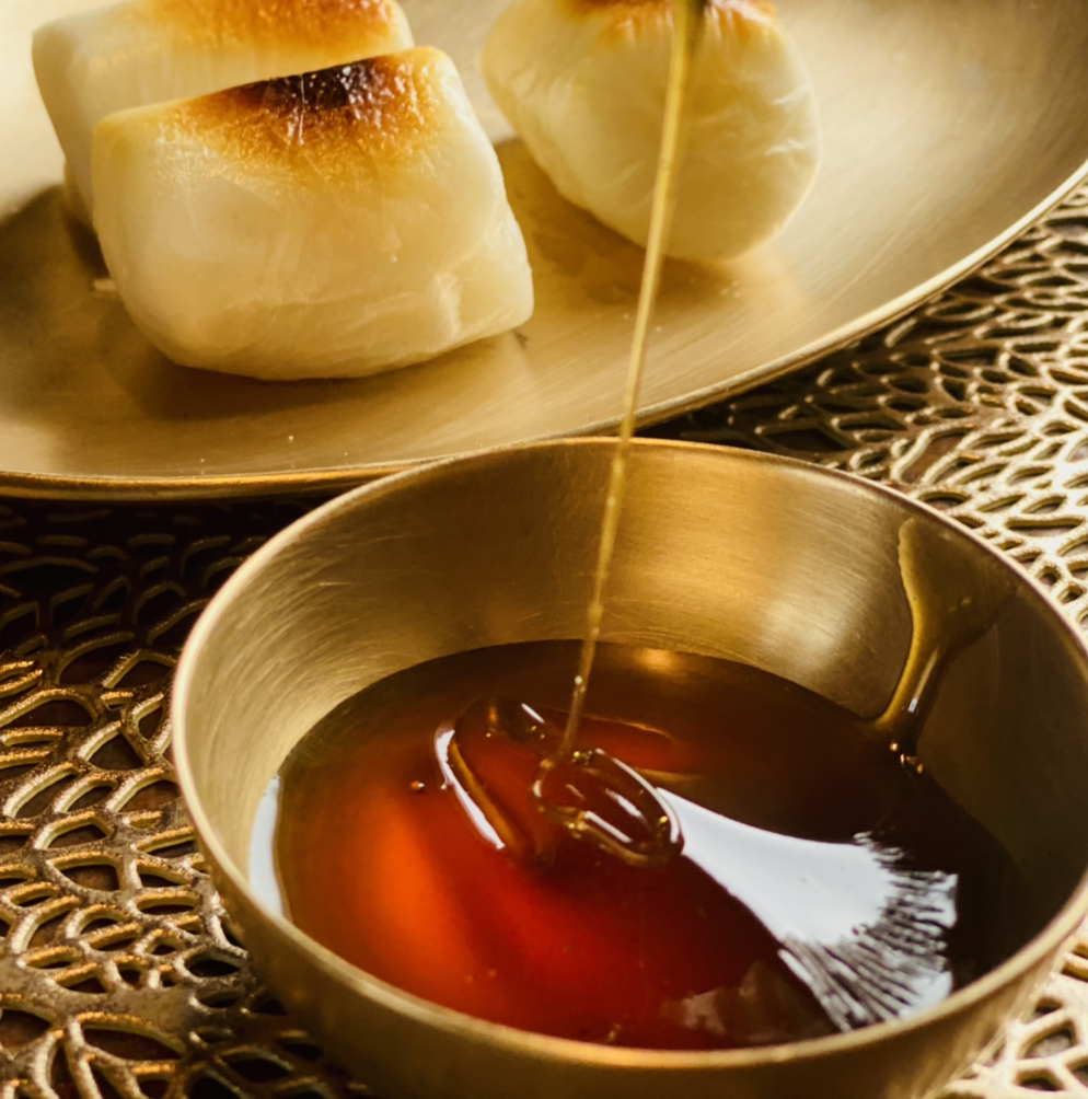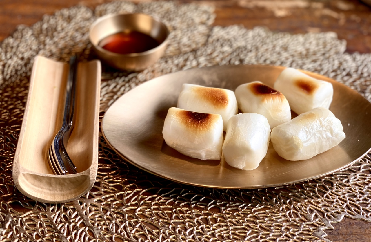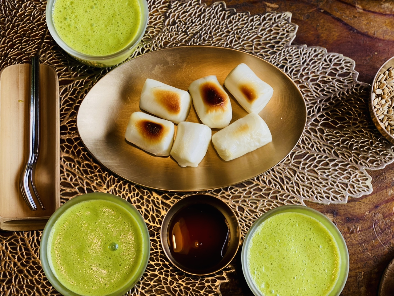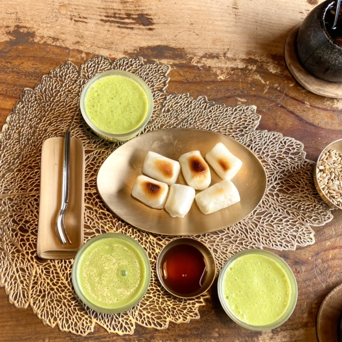 잠시 후 구운 떡과 조청이 나왔다. 그리고 솔잎 스무디도 곁들이로 나왔다. 연둣빛이 솔잎 스무디다. 후식으로 먹으라고 나온 것이다.
