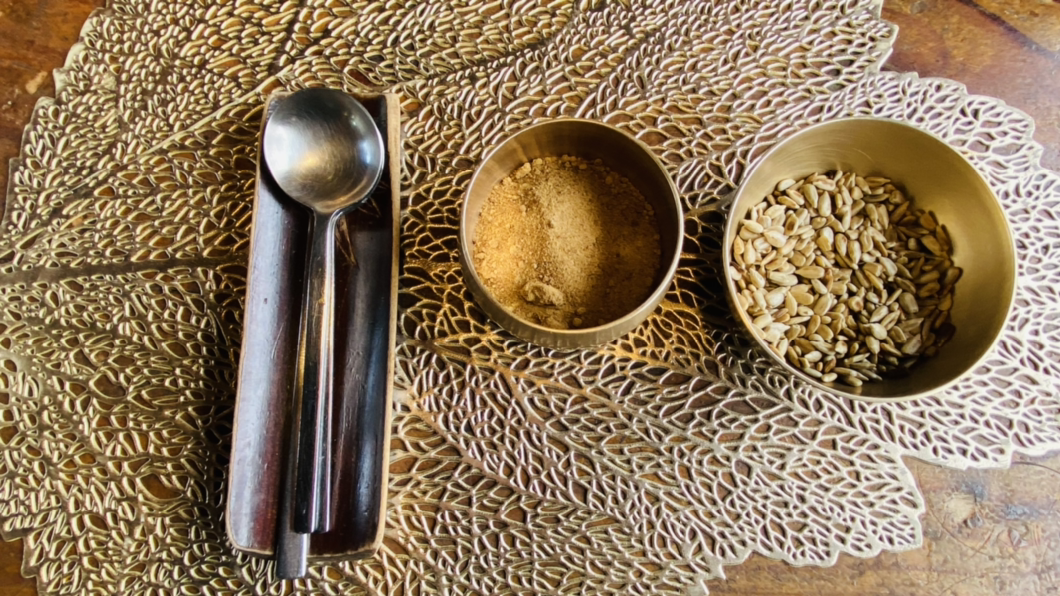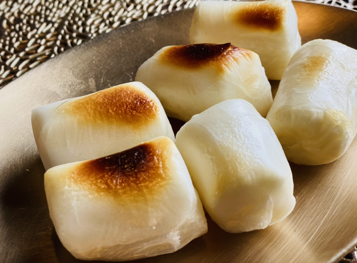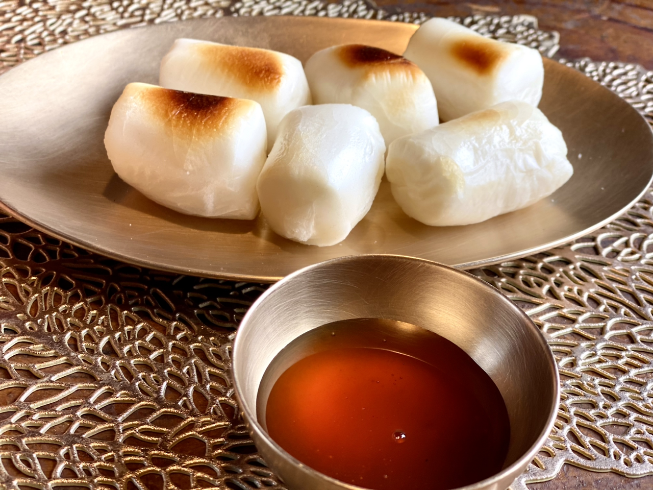 잠시 후 구운 떡과 조청이 나왔다. 그리고 솔잎 스무디도 곁들이로 나왔다. 연둣빛이 솔잎 스무디다. 후식으로 먹으라고 나온 것이다.