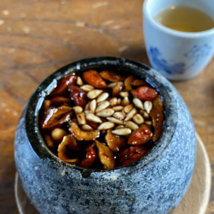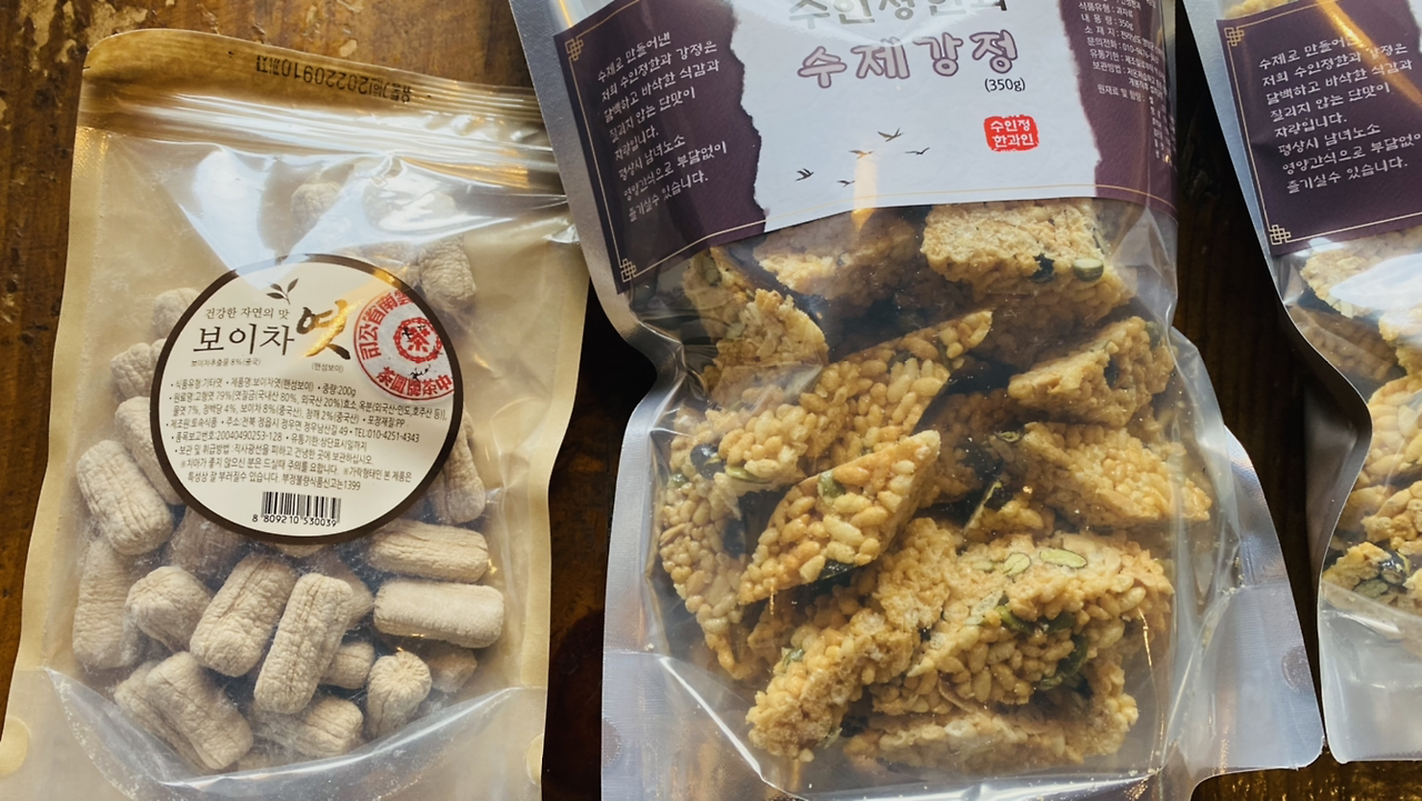 맨 왼쪽의 것이 보이차 엿인데 사탕처럼 오물거리니 맛있다. 수제 강정도 한 봉지씩 구매했다. 모두 각 1만 원씩이다.