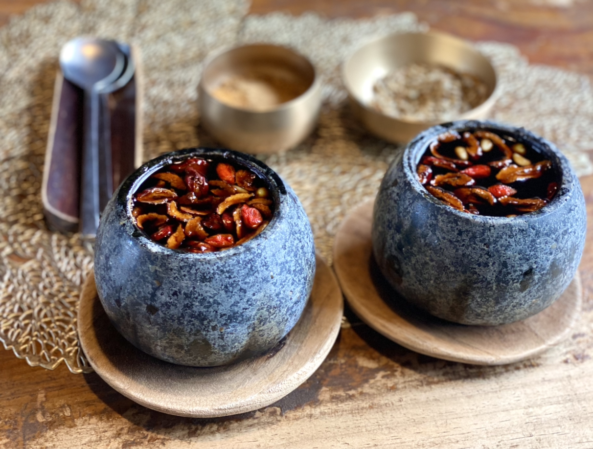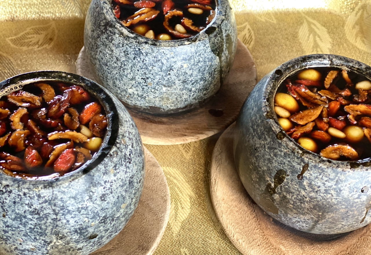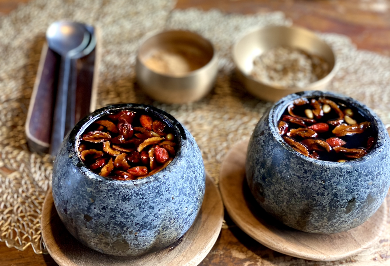 온과 냉으로 다스리는 희한한 비법이다. 뜨겁게 달군 돌그릇 쌍화차에 디저트로 솔잎 스무디라니.
