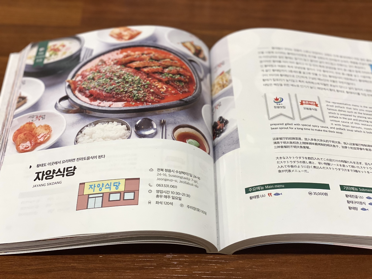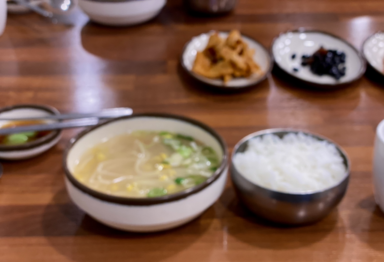 우선 상에 반찬이 가지런히 놓였다. 그다음 황태 콩나물국이 나왔다. 한 모금 들이켜니 얼큰하고 개운해서 맛있었다. 술 마신 다음 날 해장국으로 먹으러 많이 온다고 한다. '자양 식당'이라는 이곳은 전라북도 맛집 책에도 나온다.