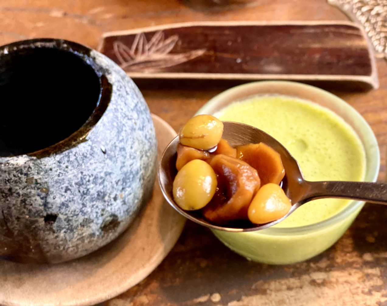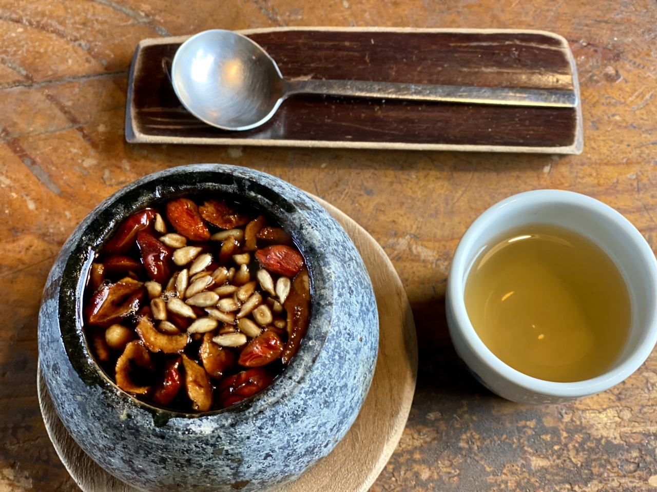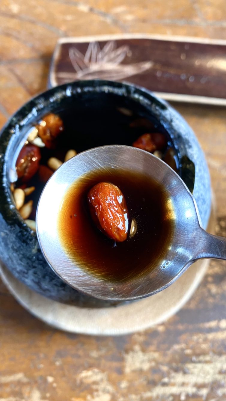 와~ 감탄을 하지 않을 수 없다. 맛이 진하다. 안에 알밤과 은행, 구기자가 있어서 건져먹는다. 구기자 한 개 숟가락에 담는다.