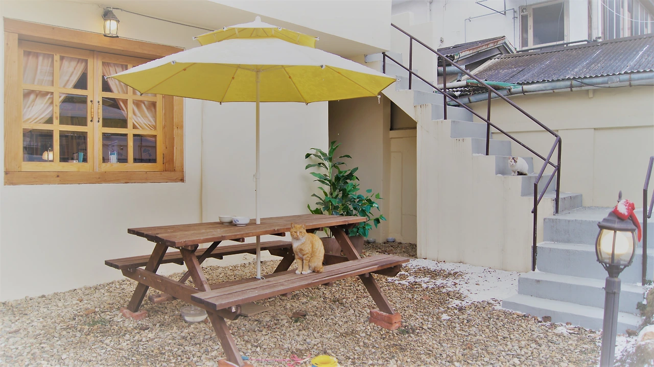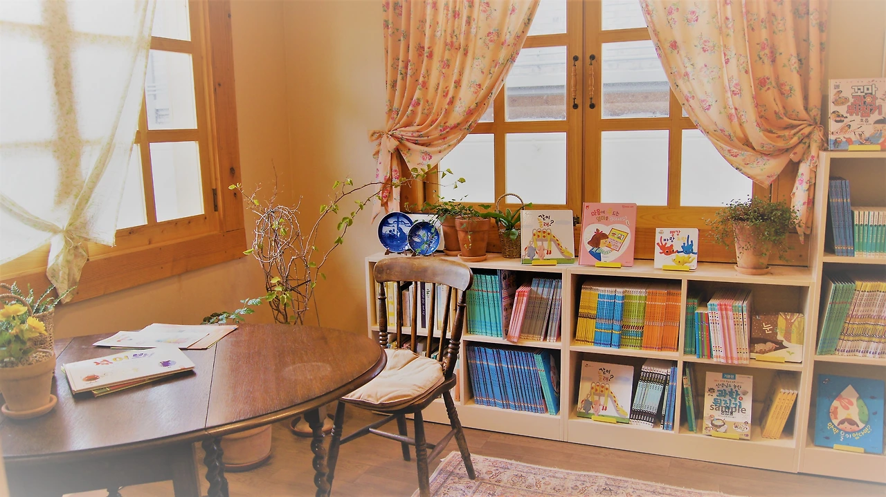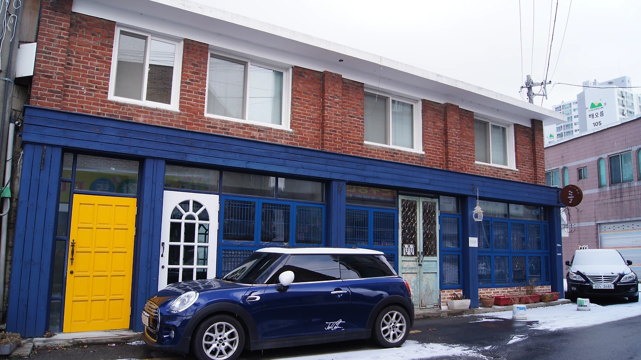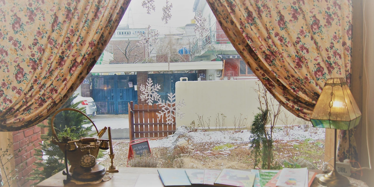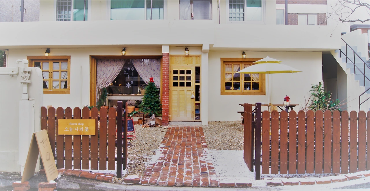 현관까지 쭉 나 있는 빨간 블록 길은 마치 도로시의 길 같다. <오늘, 나의 꽃> 집은 꽃집과 어린이 북카페다. 단독주택을 리모델링했다. 노란 우산 아래 노랑 고양이는 이 공간이 자기 집인 양 밥 먹고 놀고 있지만 길냥이다.