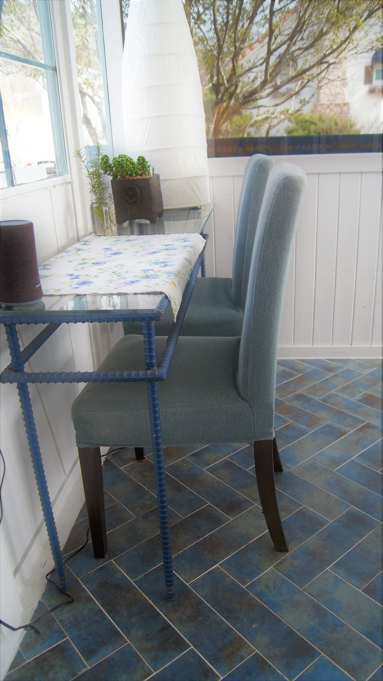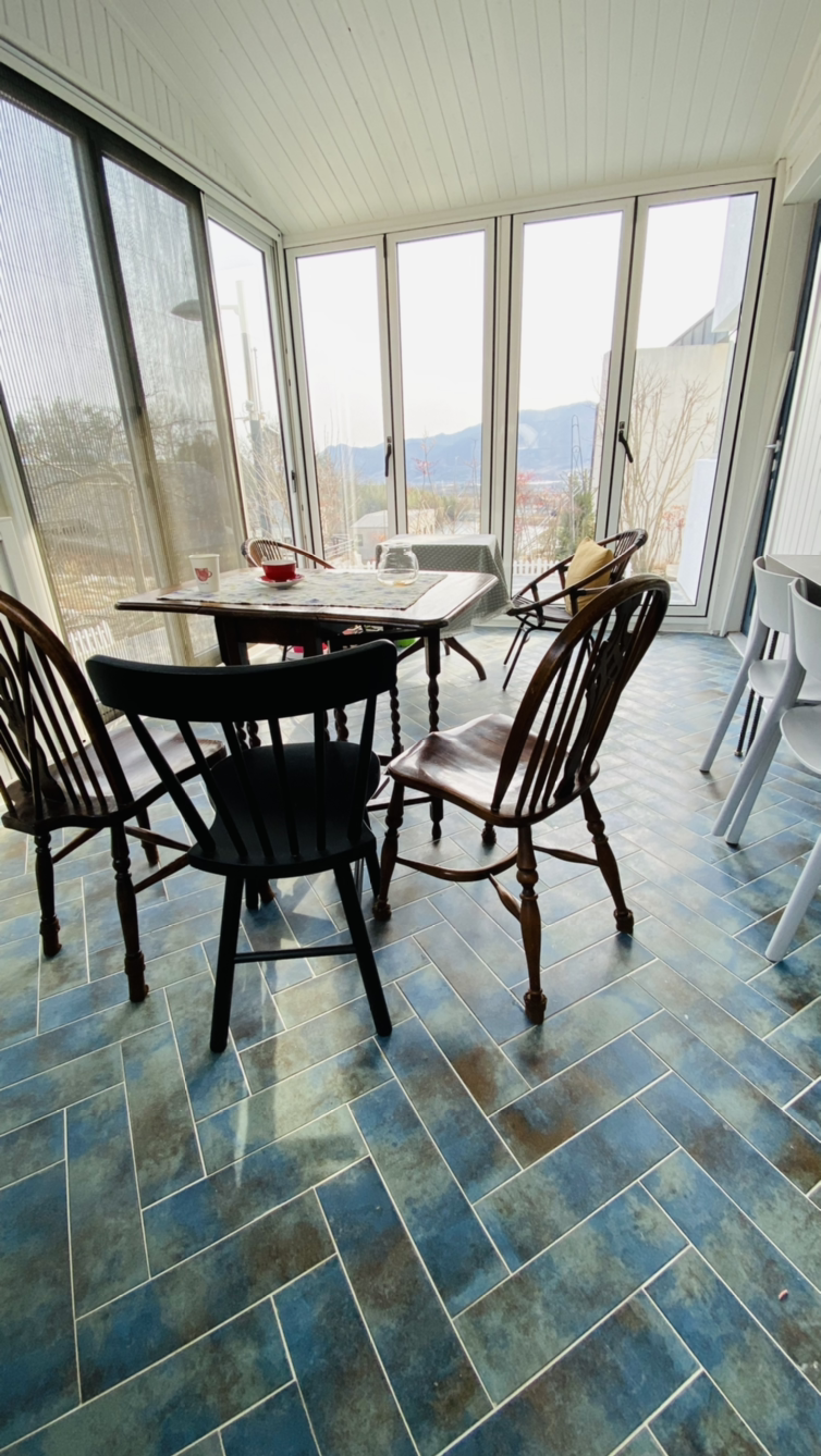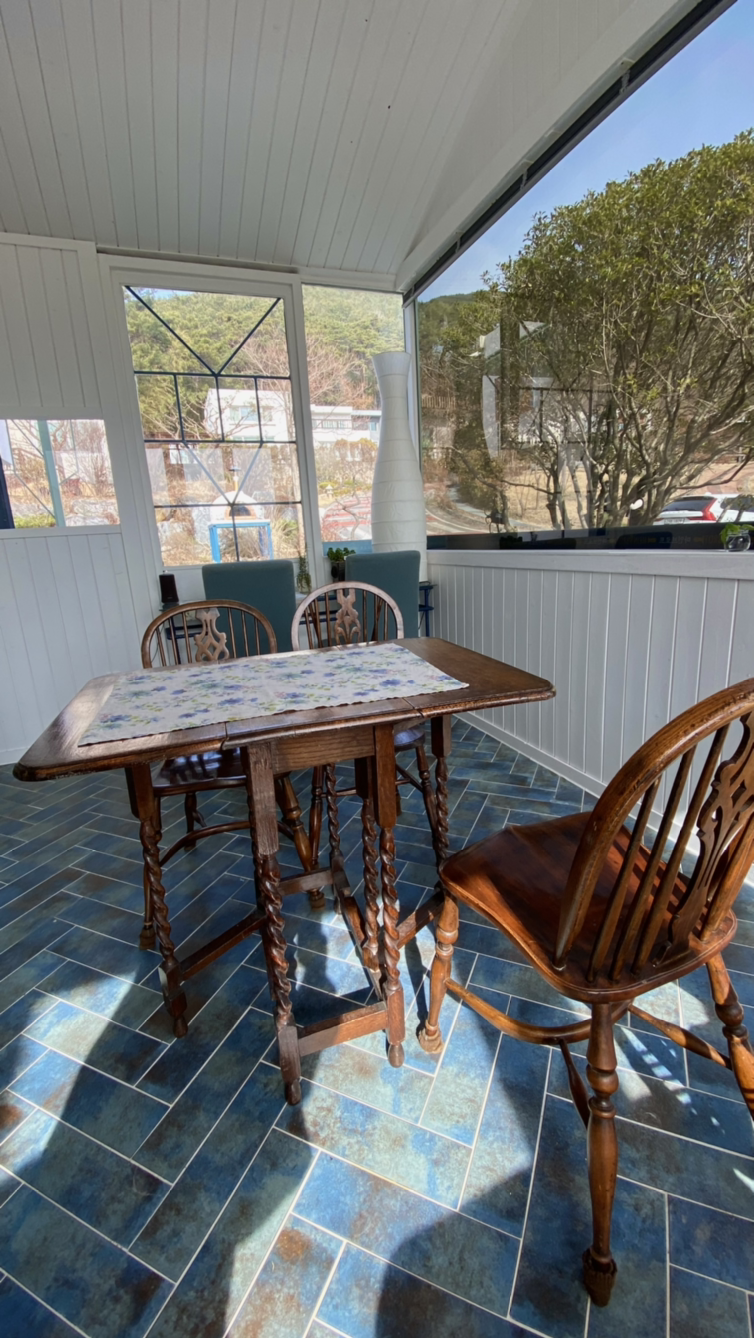 우리는 별별 수다를 다 떤다. 특히 나는 썬룸에 들어갈 때부터 바닥의 타일에 시선이 머문다. 사장님께 어디에서 구입하셨는지 여쭈니 서울 어디 물어물어 가셨다고 생각도 안 나신단다. 헤링본 스타일도 멋지지만 청색과 남색 검정과 밤색이 오묘한 조화를 이루고 있어서 색이 무척 아름답다.
