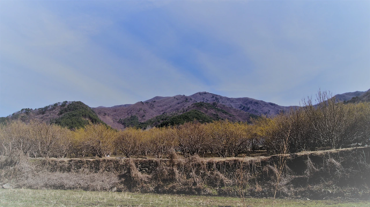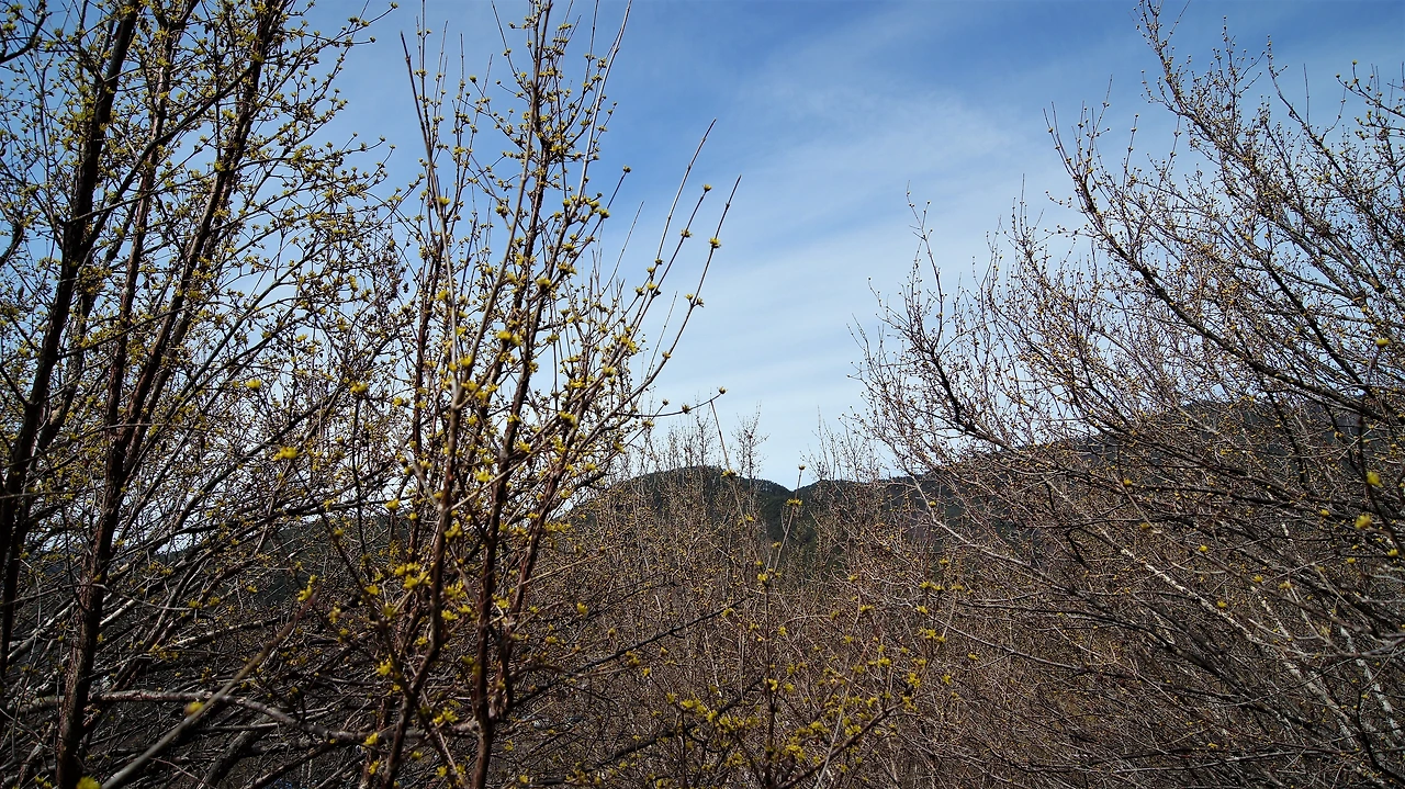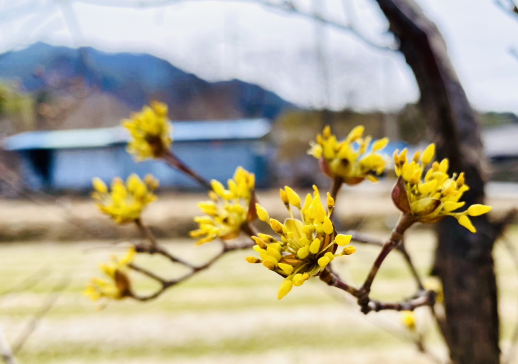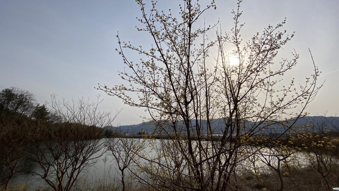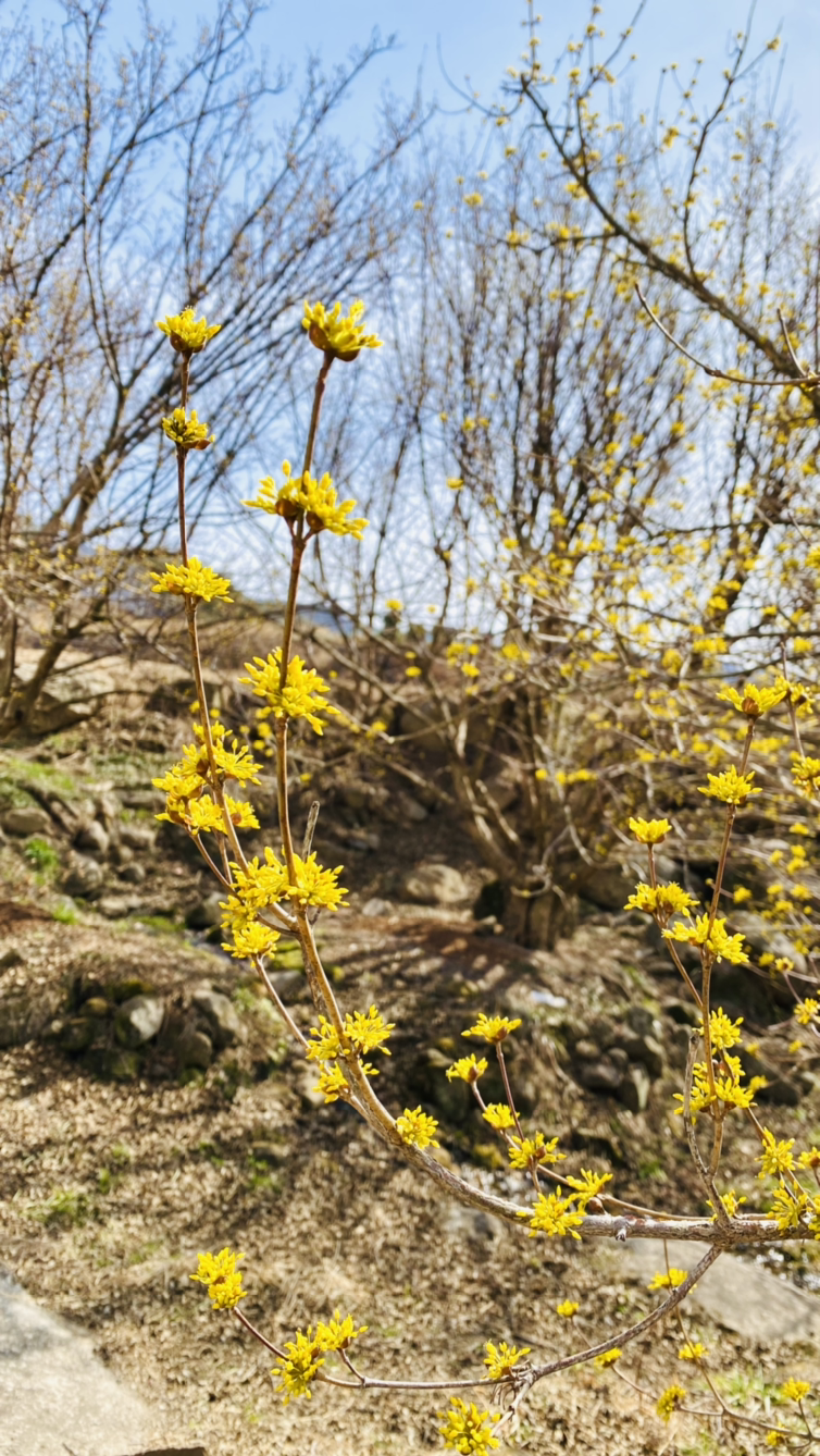 "저기 위에 산수유 마을 보이네. 그런데 아마 여기가 더 핀 걸 거야. 마을 쪽은 안 피었을걸? 원래 2주 후쯤 와야 만개할 거야. 그럴 것 같더라. 지금 개화시기가 아니야~. 3월 20일 이후에 한창이어서 그때 산수유 축제를 한대. 그런데 올 해는 안 한단다. 코로나 때문에." 운전 중인 제니퍼가 대답한다.