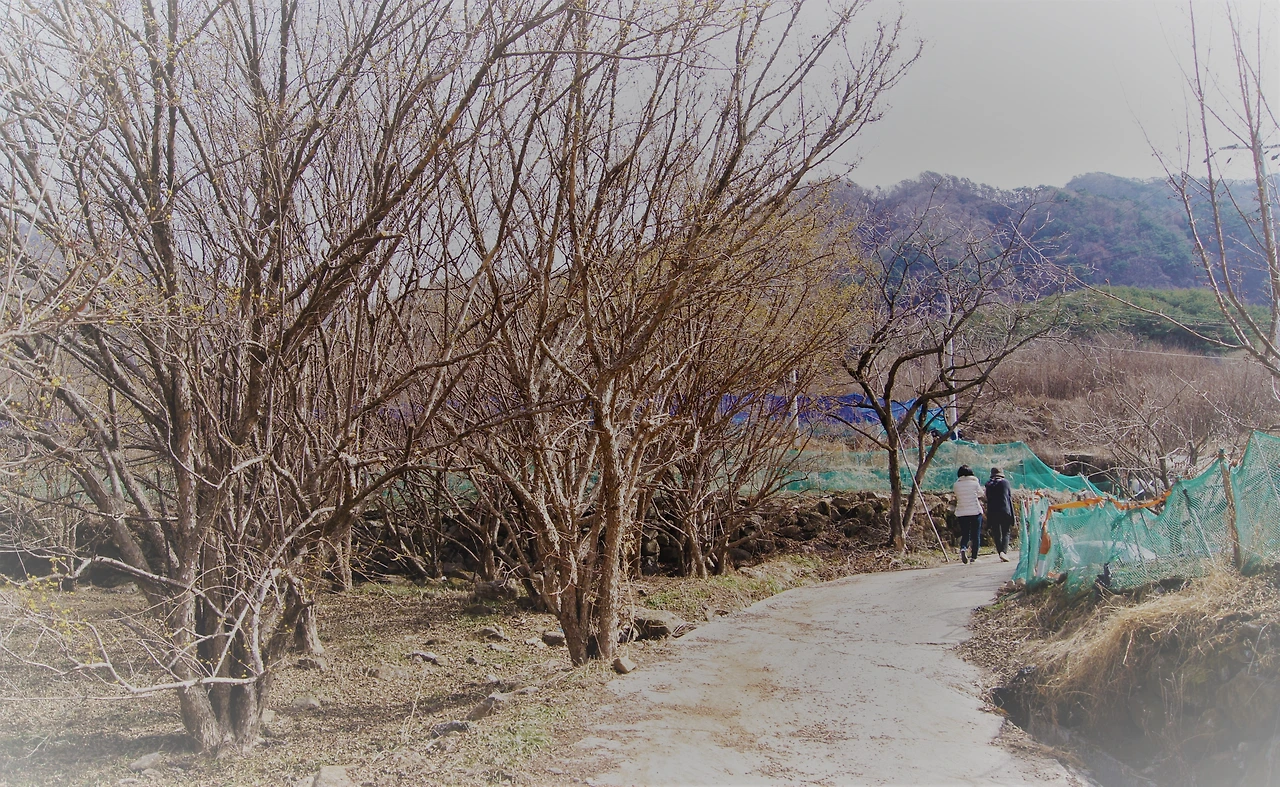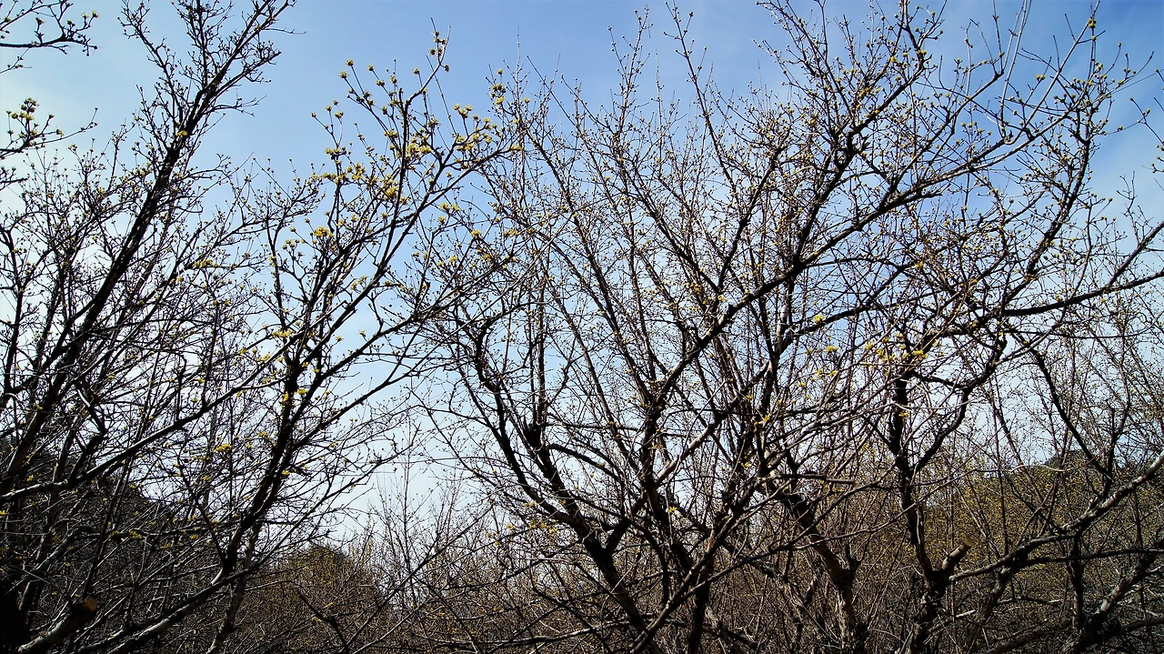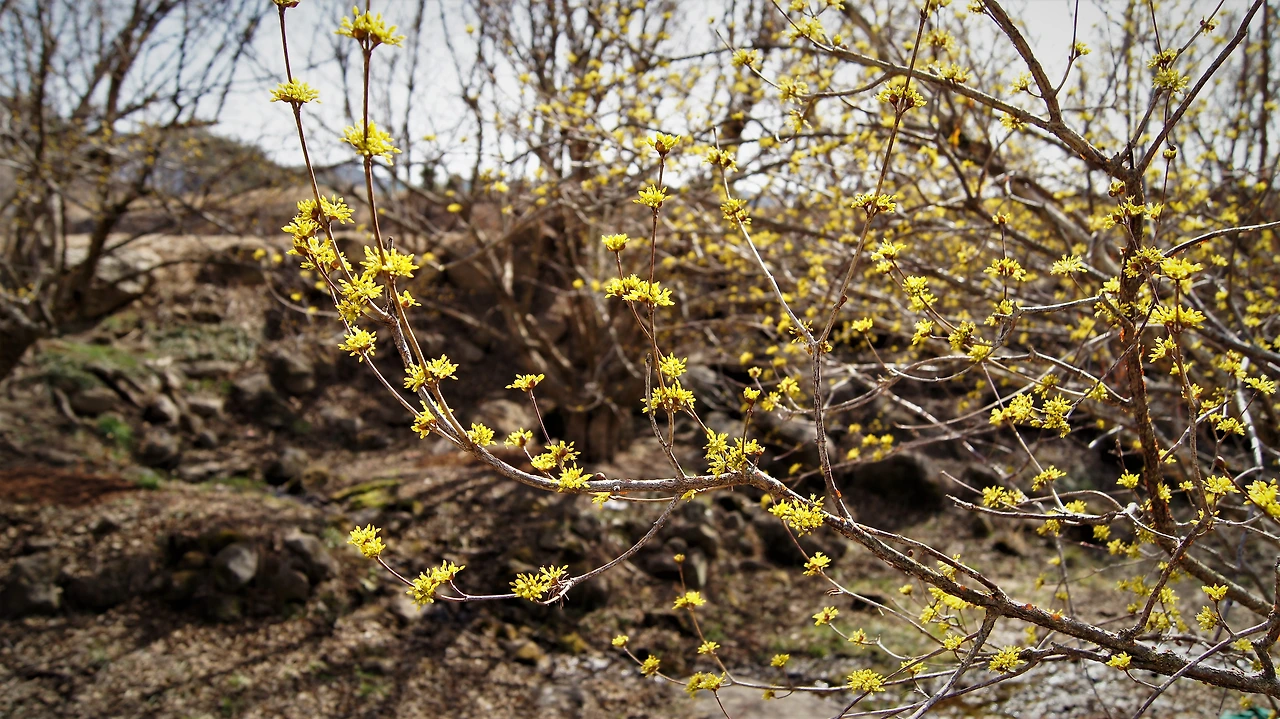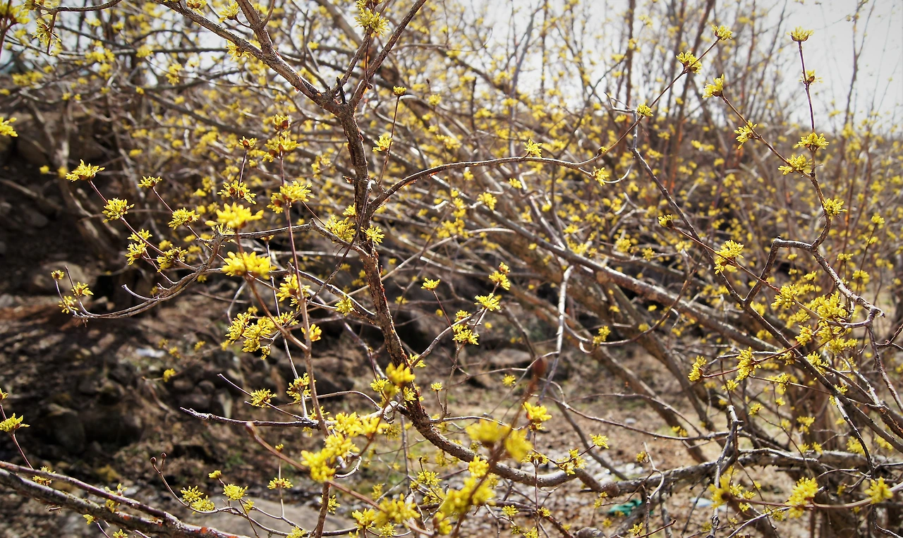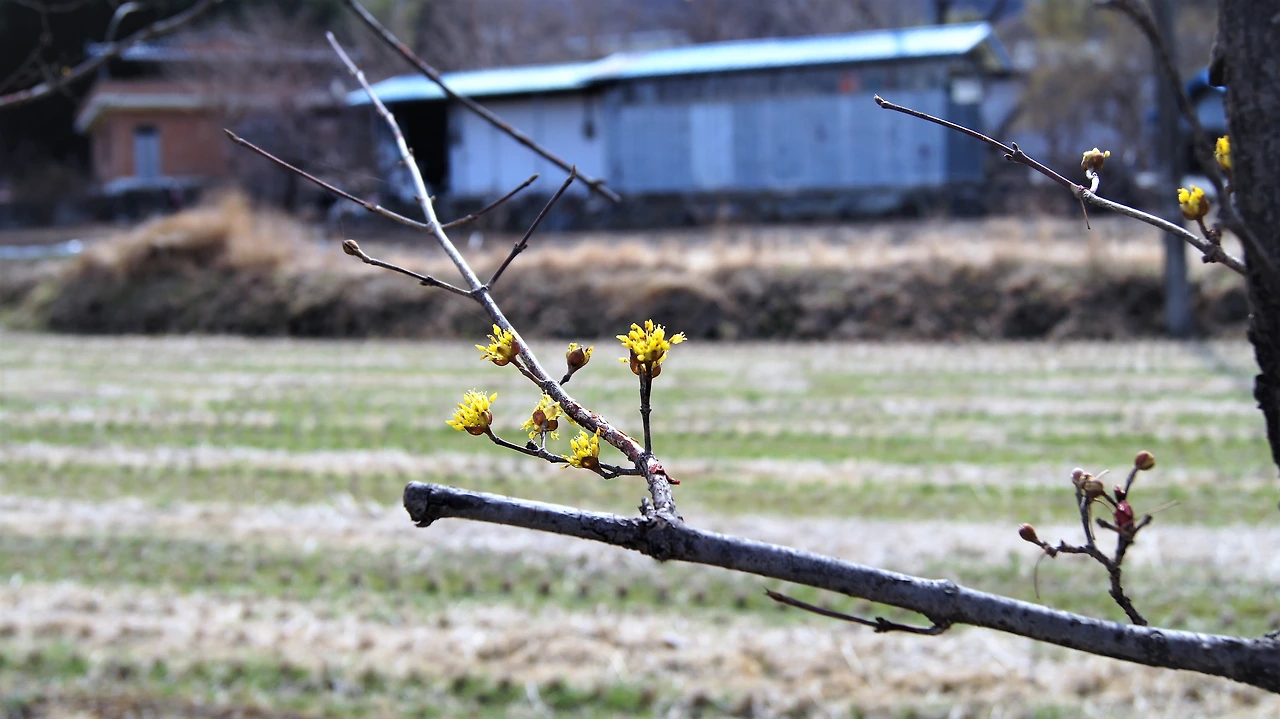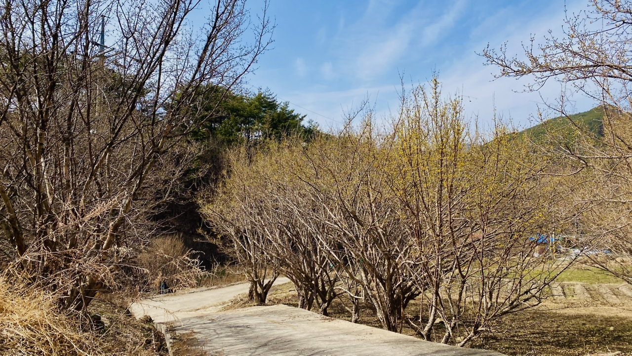 "어, 잠깐~ 여기 좀 세워봐. 차 안 다니니까 길가에 세워도 되겠지? 산수유 마을이라서 그런지 가로수도 산수유다. 그런데 별로 안 피었어." 내가 말한다.