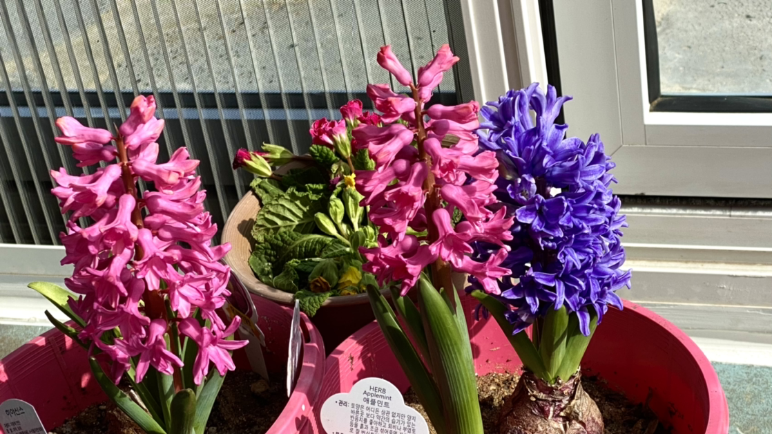 "이거 히야신스 맞지? 아휴~ 예쁘겠다. 그런데 저 테이블 정말 예쁘다 그렇지."