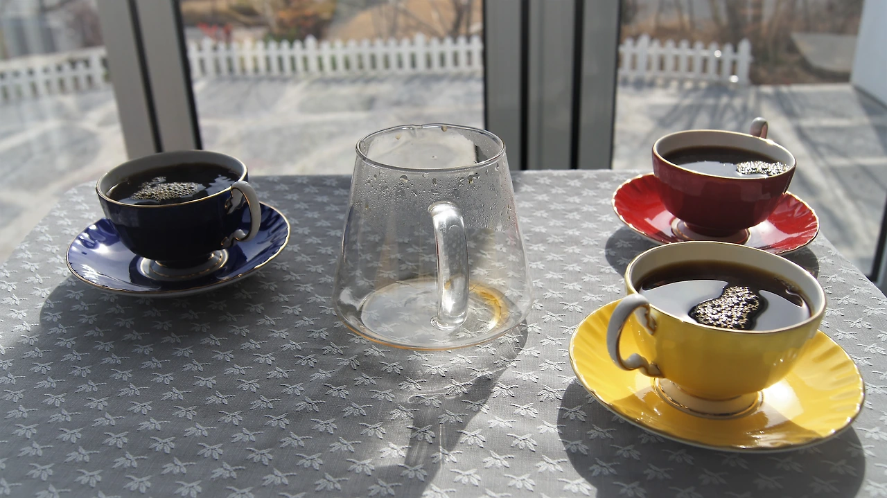 커피잔들이 예쁘다. 안쪽에 화려한 꽃자수와 같은 무늬가 있다. 드립 커피 6천 냥이다. 그런데 머그잔이 아니라서 좀.... 그래도 두 번 내려 주셔서 나는 서로 다른 맛을 두 잔 마셨다. 야호~!
