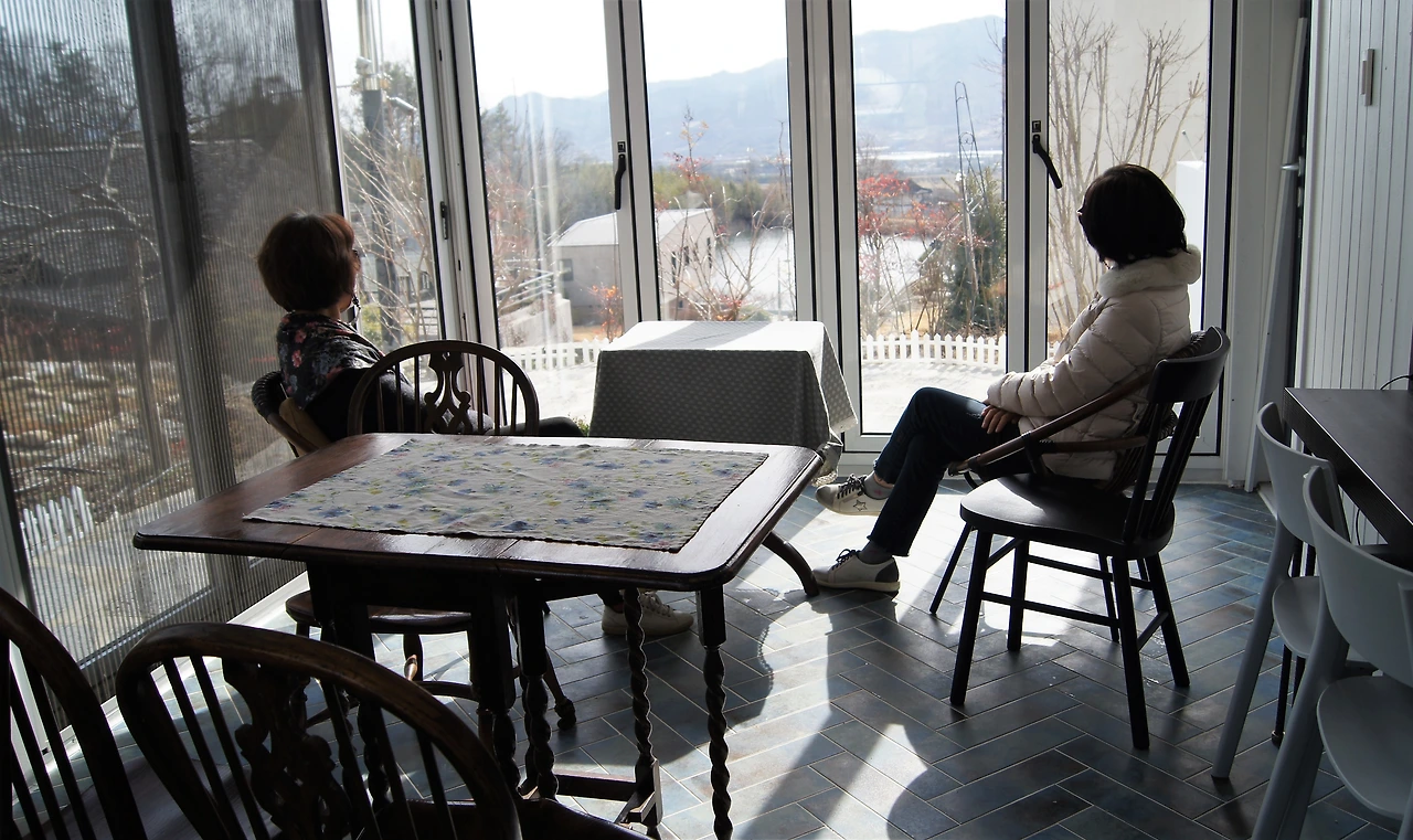 찻집에 들어서니 썬룸이 있다. 우리는 썬룸에서 마시기로 한다. 드립 커피만 있다고 해서 기다리면서 창밖 너머 호수를 본다.