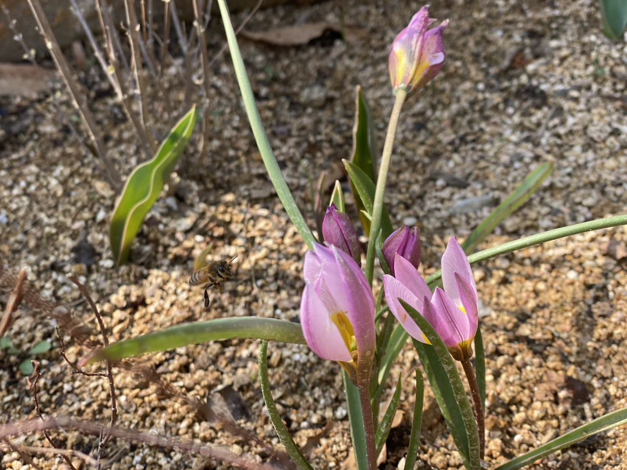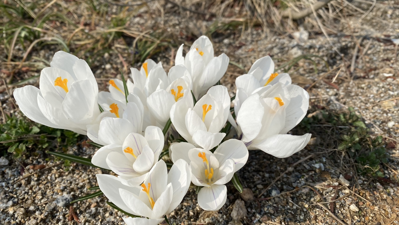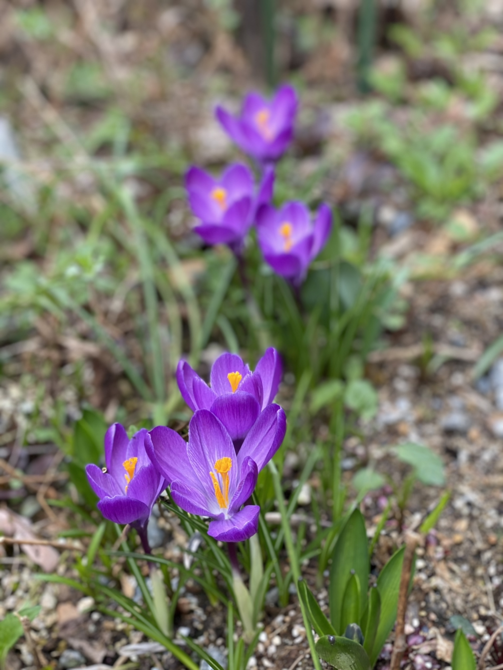 봄을 알리는 꽃들은 바닥에서 새싹이 나오고 꽃도 살포시 얼굴을 내민다. 친구네 주택의 크로커스가 신부의 부케처럼 피어있다.