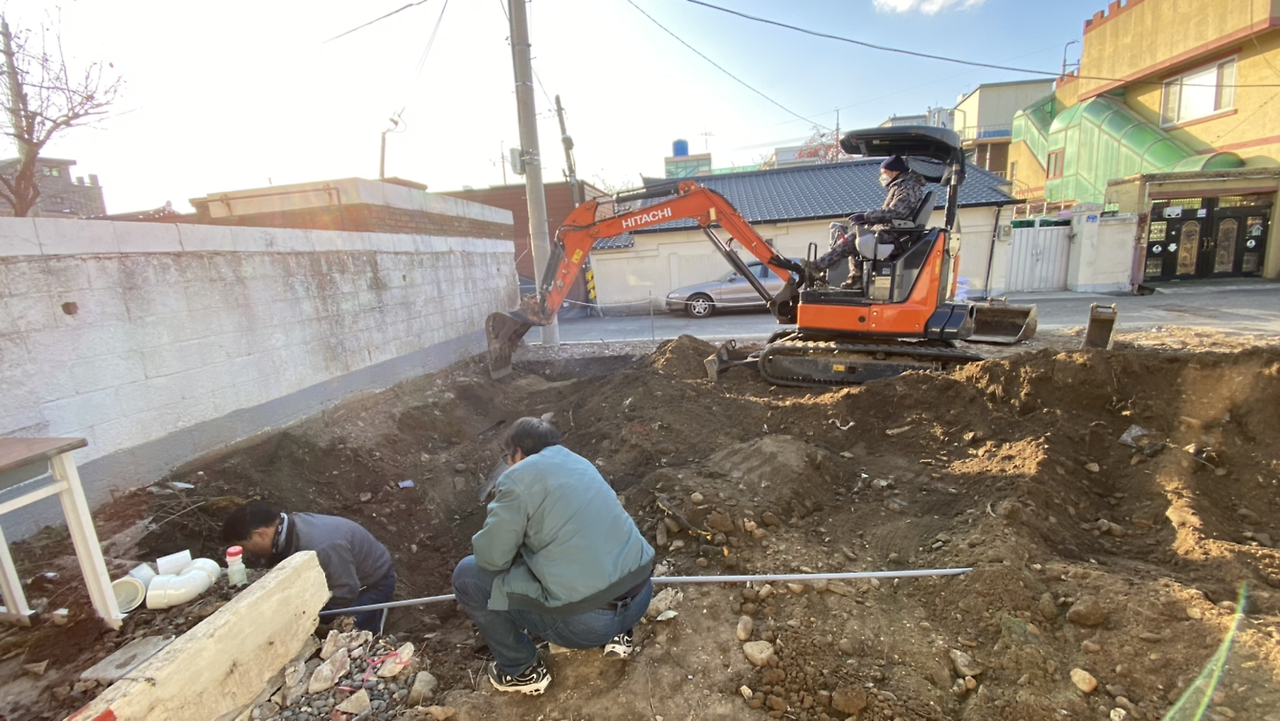 동생이 마당을 정비하면서 부서졌던 수도관을 다시 연결했다. 마당에서 수돗물을 마음 놓고 사용하도록 했다. (동생의 친구들이 손수 작업을 도와주는 모습이다.)