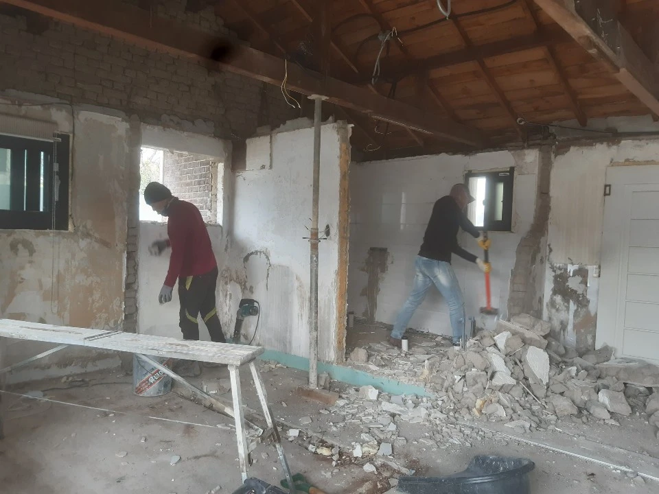 정문의 폴딩도어가 아닌 옆문으로 드나드는 문을 다시 내기 위해 벽을 허무는 모습이다. 왼쪽 문 내는 모습. 오른쪽 화장실 벽 철거 모습. 화장실은 환기구도 없는 상태라서 철거할 수밖에 없었다. 철거하고 벽체 세운 후 파벽돌로 마무리할 예정이다.