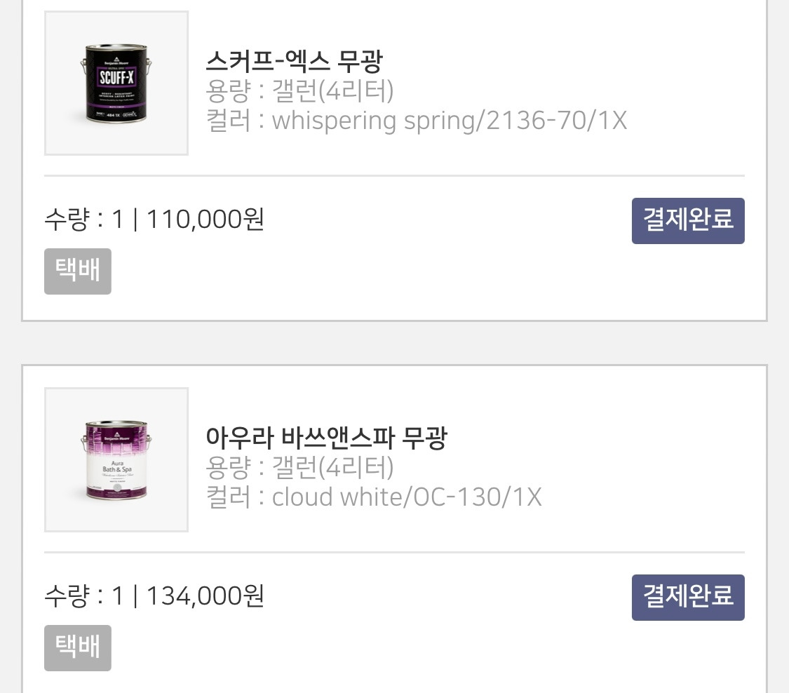 가격도 비싼 벤자민 무어 페인트는 1리터만 필요하다고 해도 4리터를 무조건 사야 하는 단점이 있다. 그래서 두 색을 사서 조제해서 사용하기도 한다. 또는 두었다가 다른 곳을 칠하기도 한다. 일 년 정도는 굳지 않았다. 수성 같은 경우 물 타서 사용 가능하다.