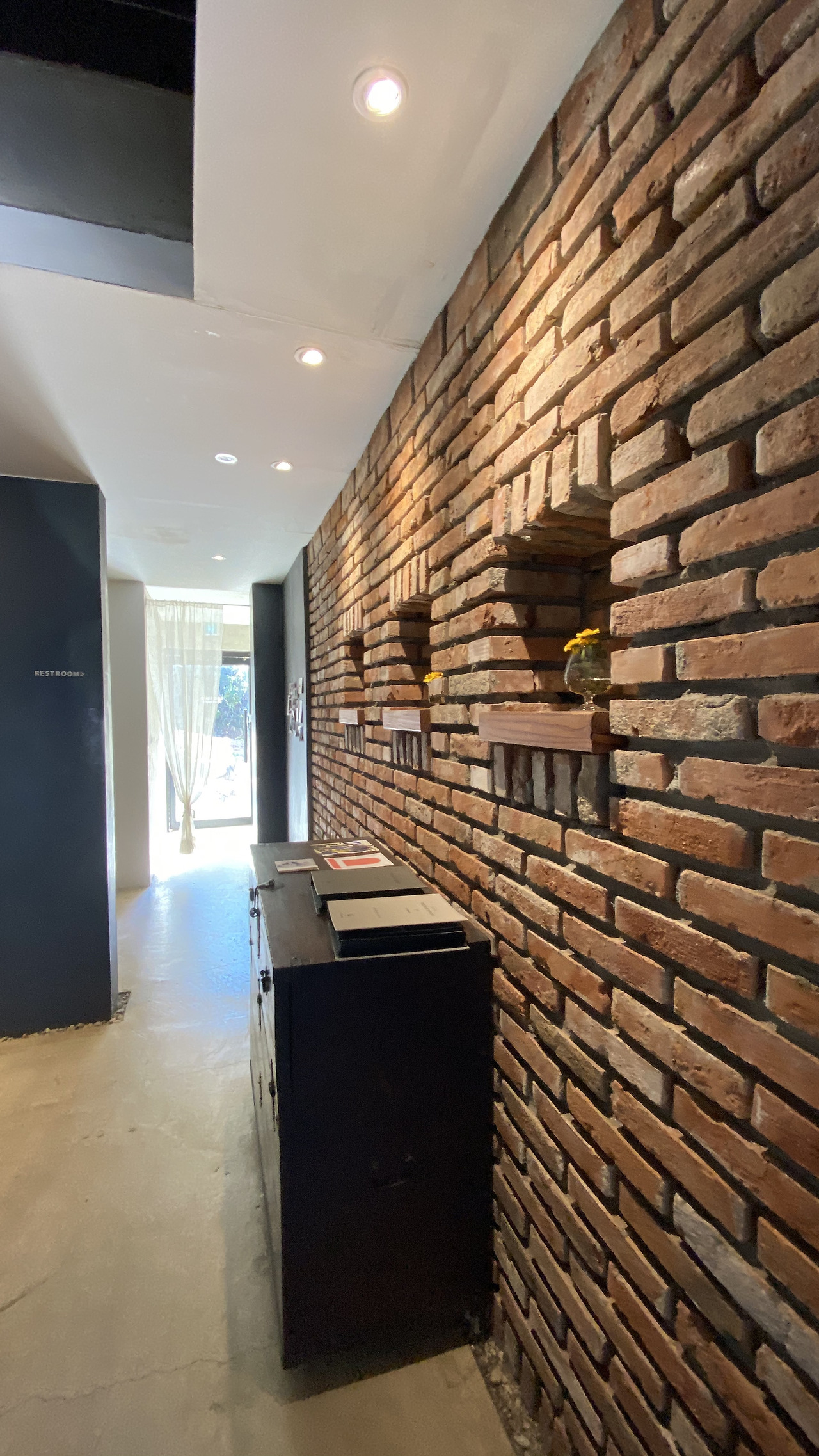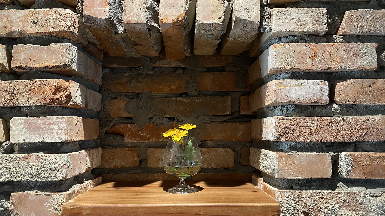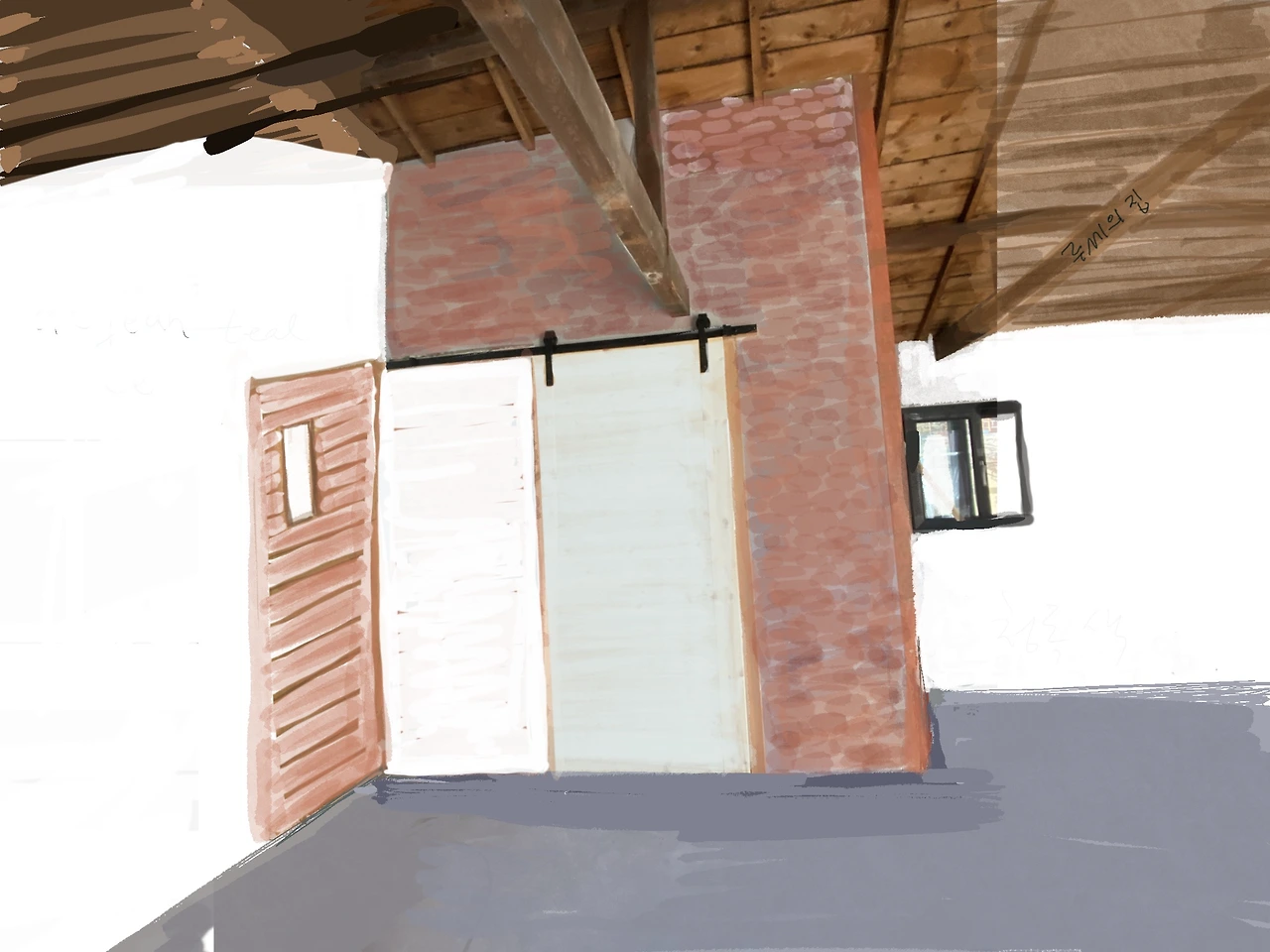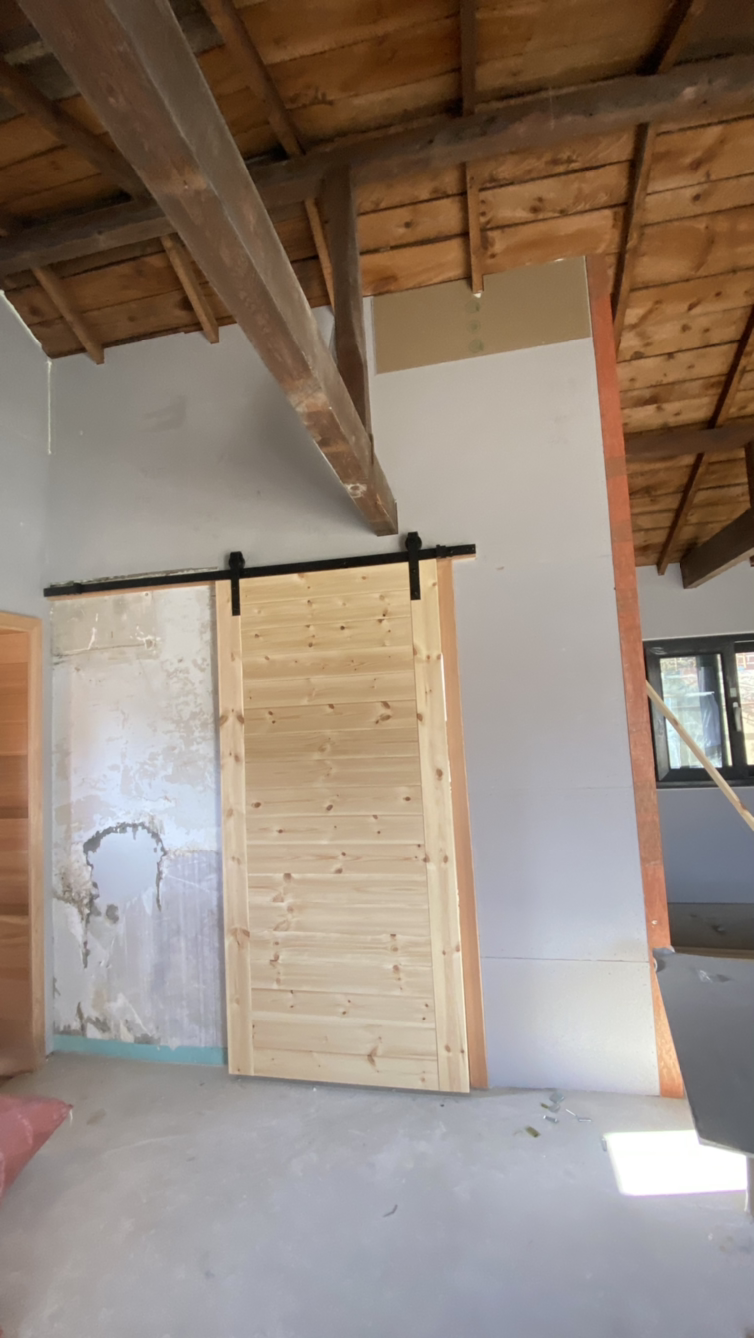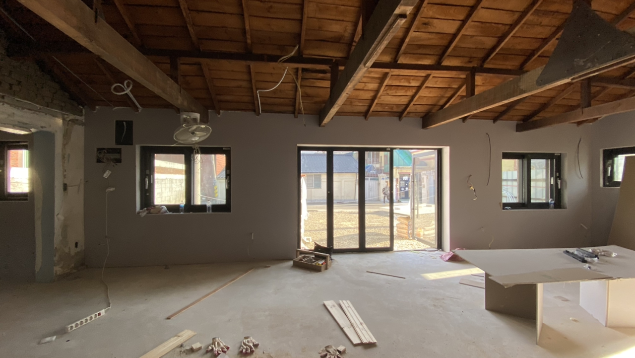 화장실 쪽의 기존 벽을 허물고 다시 세웠다. 현관과 화장실 도어는 현장에서 직접 제작된 것이다. 벽의 미장을 하고 난 후에 붉은 계열의 파벽돌로 최종 마무리하기로 했다.