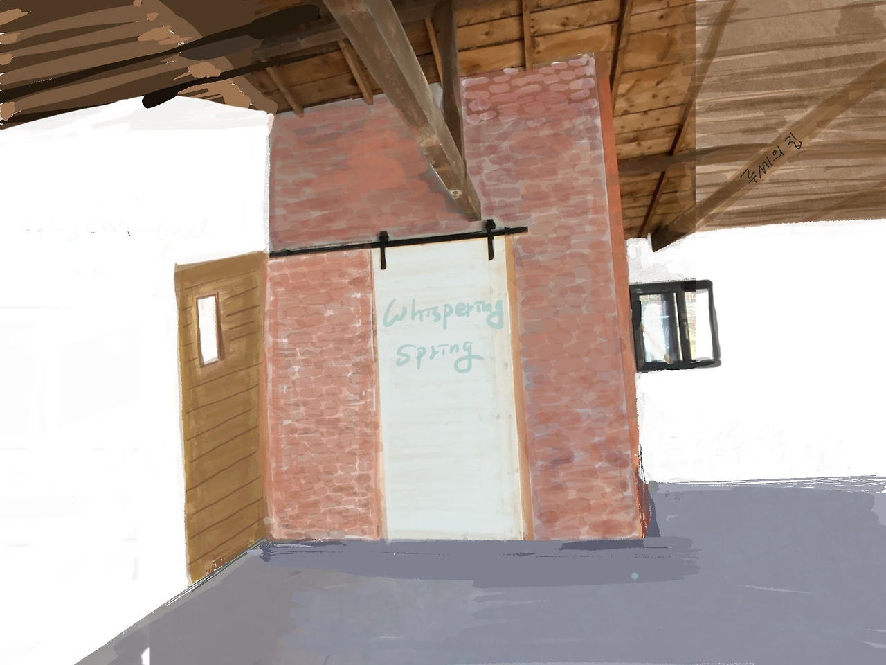 화장실, 파우더 룸으로 들어가는 문은 행잉 도어로 만들었다. 옹이도 귀엽기는 한데 바탕의 나무 결이 보이는 정도로 살짝 파스텔 톤으로 칠하고 싶다.