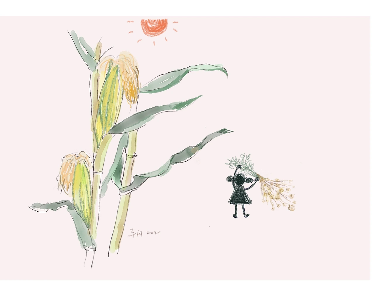 감자를 캐다 지치면, 할머니가 싸 오셨던 간식을 먹었다. 그리고 밭 가장자리에 줄지어 있는 것 중 적당한 옥수숫대의 줄기를 벗겨 그걸 쭉쭉 짜 먹었다. 옥수수 줄기는 다소 거칠어서 즙을 짜 먹다 입안에 상처가 나기도 한다. 수숫대의 줄기보다 덜 달지만 노동의 대가로 충분히 맛있었다. 옥수수수염을 머리 모양으로 땋아 동생 머리에 걸어주고 시시덕거리기도 했다.
