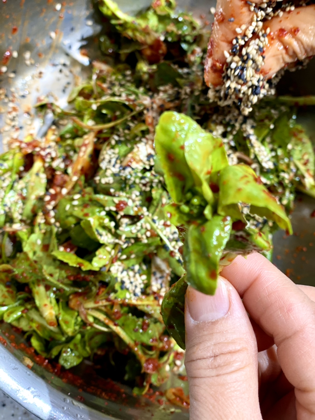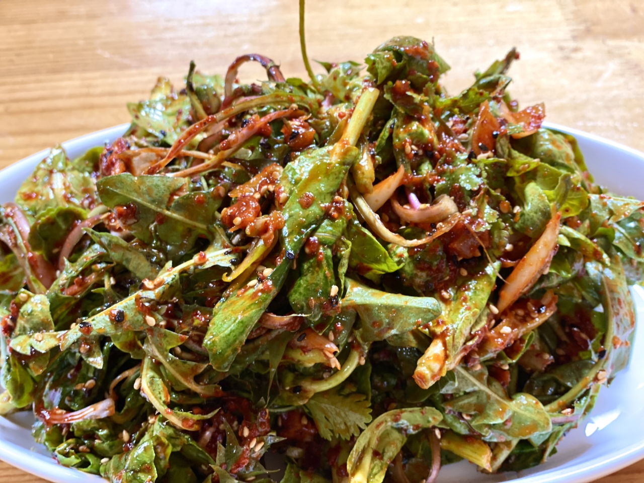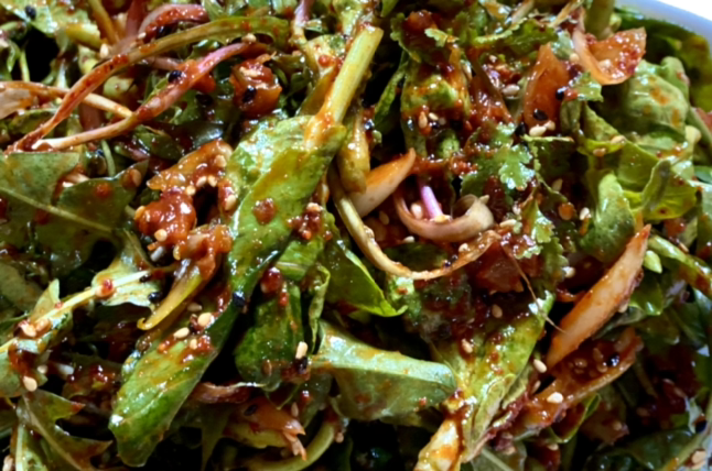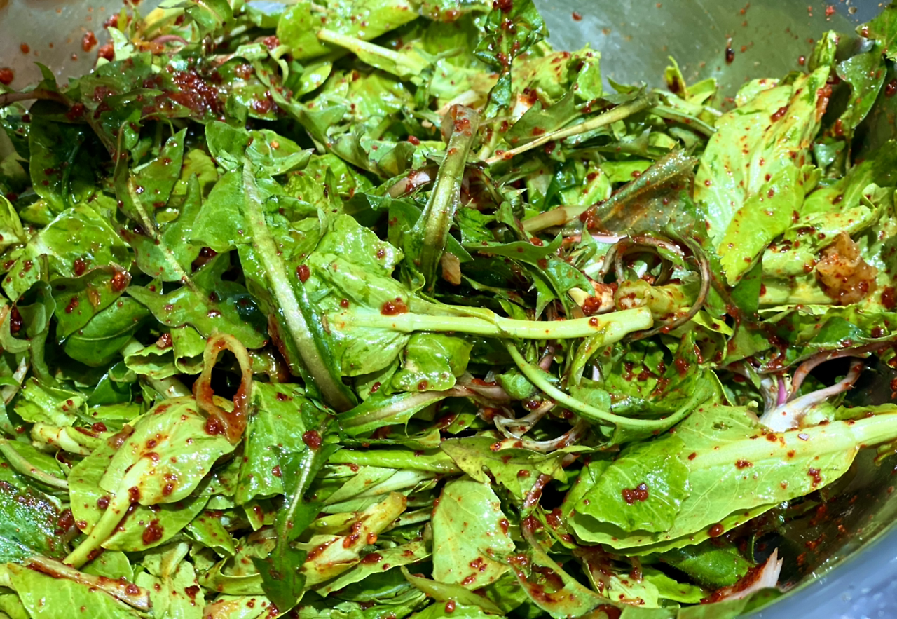 봄동 겉 절이, 줄리아 남편이 봄동 밭을 갈아엎으려 해서 정신없이 위만 땄다고 한다. 봄동 윗부분, 민들레, 고수 몇 잎을 따서 금세 맛있는 겉절이를 만들었다. 고수는 딱 다섯 잎 들어갔는데 향을 내다니 정말 신비한 식물이다. 우리 중 고수 못 먹는 사람 없어 다행이다.
