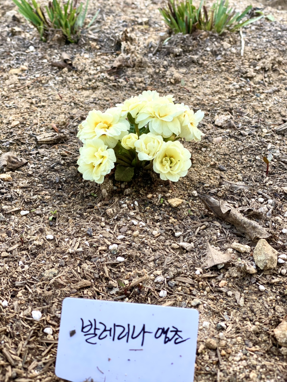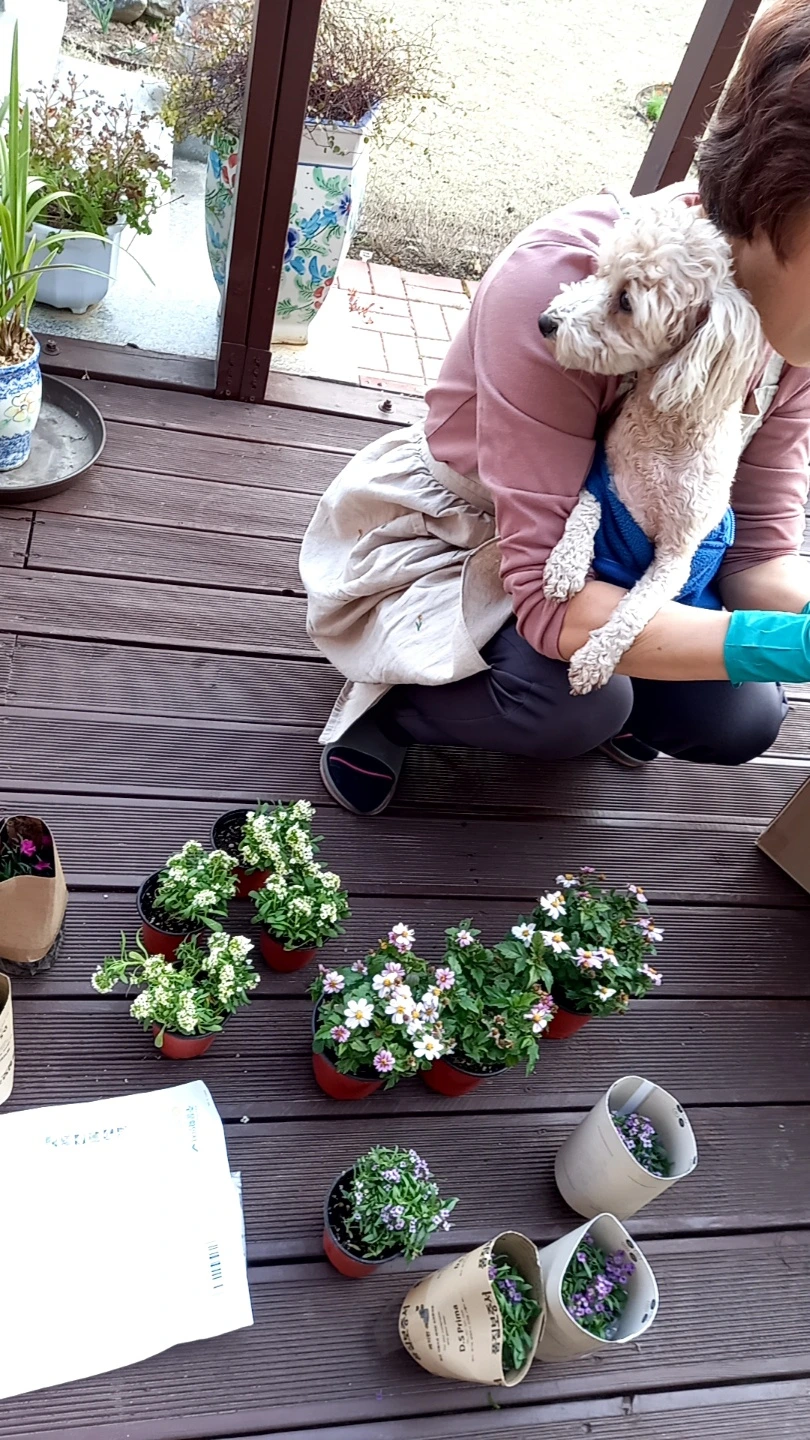 출입구 길 쪽에 꽃이 월동하는 것이 아니란다. 화분으로 옮기고 꽃잔디를 심는다고 둘이 앉아 있다.
