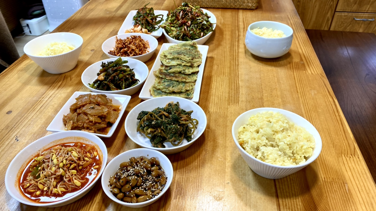 열심히 꽃을 심고 들어 온 줄리아는 그제야 밥을 솥에 안쳤다. 나는 늦어질 듯해서 그냥 쑥전만 먹자 했다. 그런데 무슨 마법사처럼 아주 순식간에 상을 거하게 차린다. 이렇게 손 빠른 주부 처음 봤다.