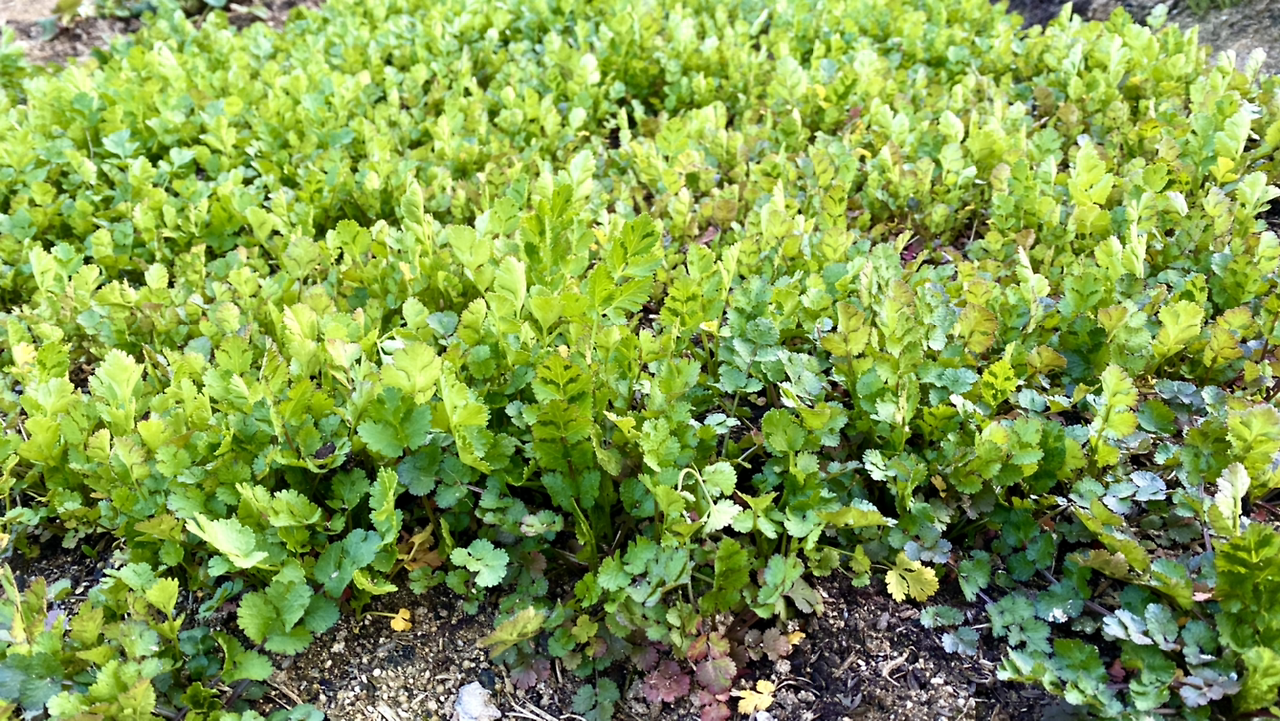 줄리아가 우리를 이끌고 바로 아랫집 마당에 데려갔다. 미나리와 비슷하다. 친구들이 미나리 아니냐고 하는데, 미나리는 개천에 물이 있는 곳에 있다. 이상하다 여겼는데 '고수'로 판명이 났다.