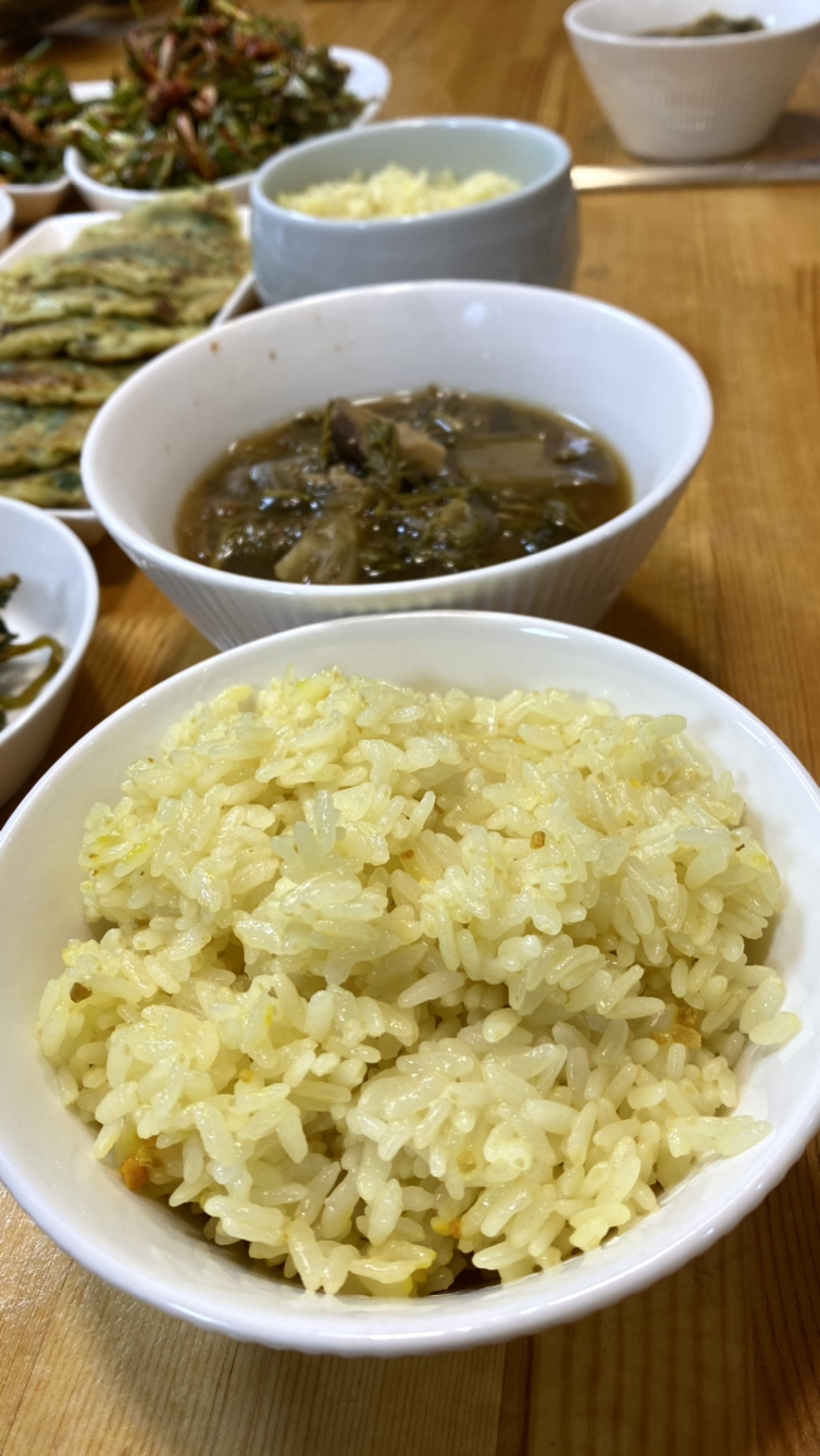 울금 밥, 매일 밥에 조금씩 넣어 먹는다고 한다. 맛도 있고 항암효과도 있단다.