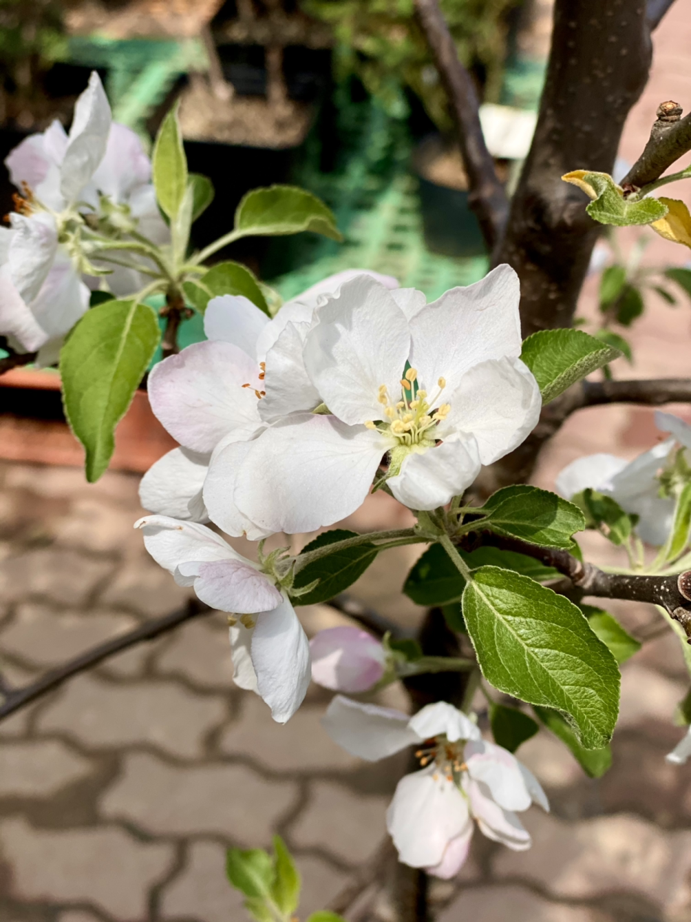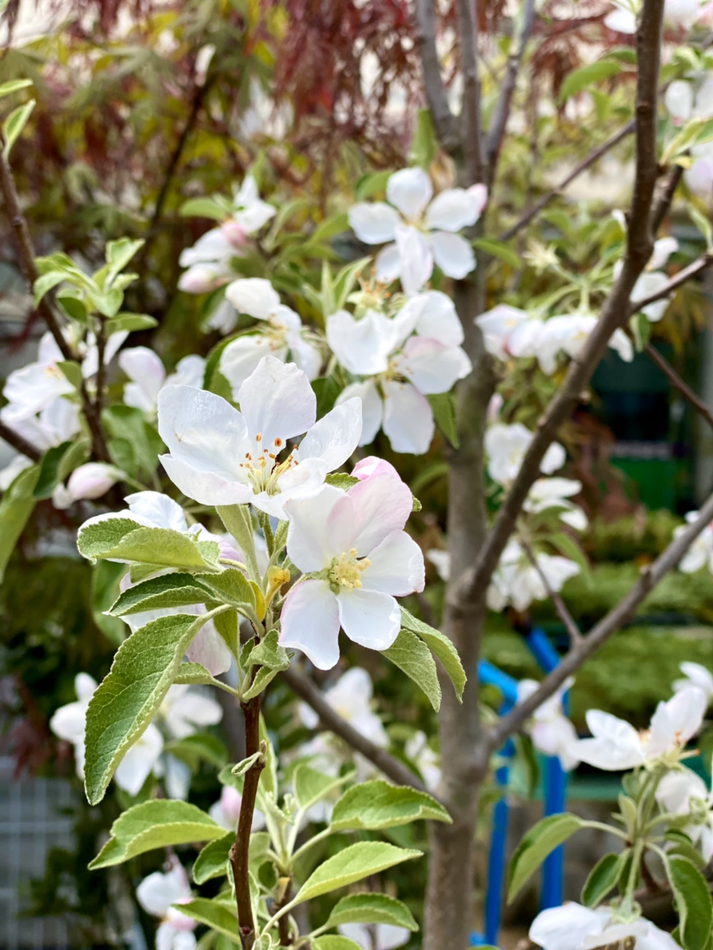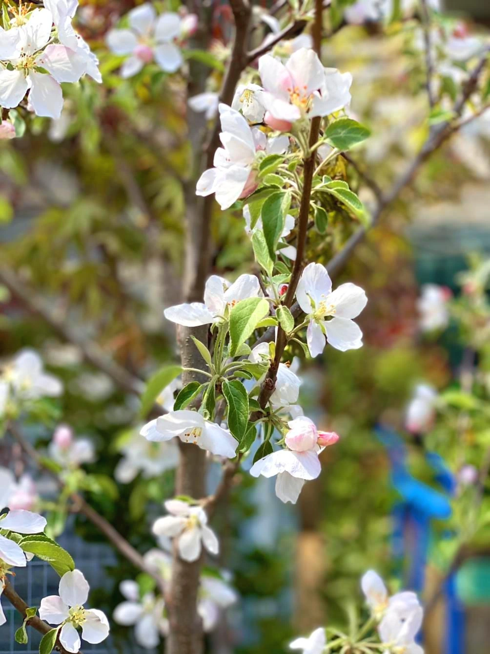 사진을 찍으려고 보니 어제 그토록 예쁘게 매달려 있던 꽃들이 바람에 떨어져 버렸다. 어젯밤 강풍이 불었다고 한다. 안쪽에 있던 것은 그럭저럭 남아 있다. 미니 사과 꽃과 홍로(홍색 사과 품종)는 그 모양새가 비슷하게 보인다. 단지 홍로가 훨씬 꽃의 크기가 크다.