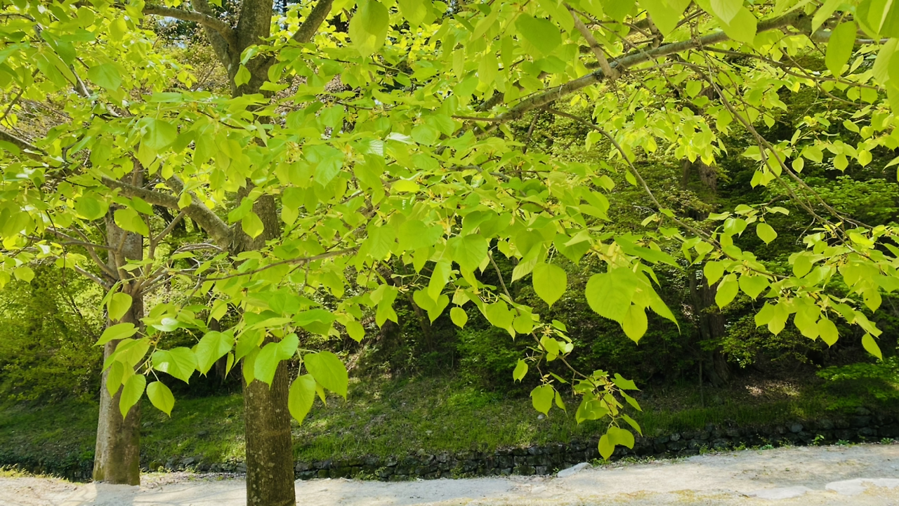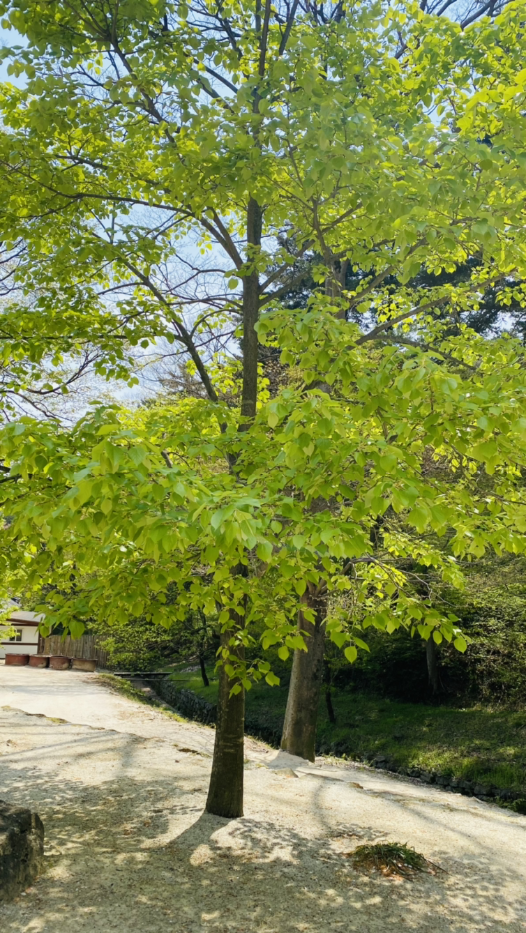 길 양옆의 벚꽃 나무들이 꽃잎을 떨어뜨린 후 연둣빛 새싹을 내놓았다. 꽃 잔치가 끝났지만 새로운 탄생의 시작을 알린다. 다양한 나무의 연둣빛은 순수하고 말간 아기 볼 같다.