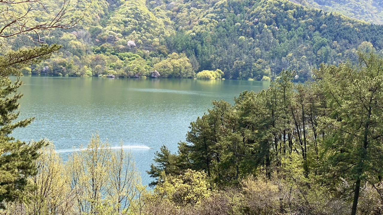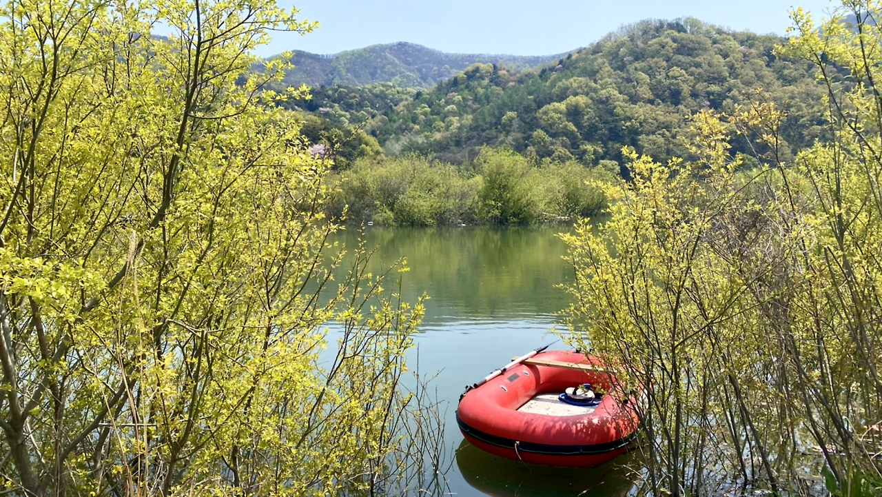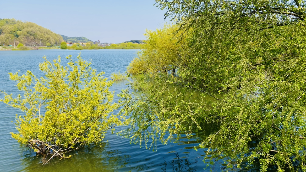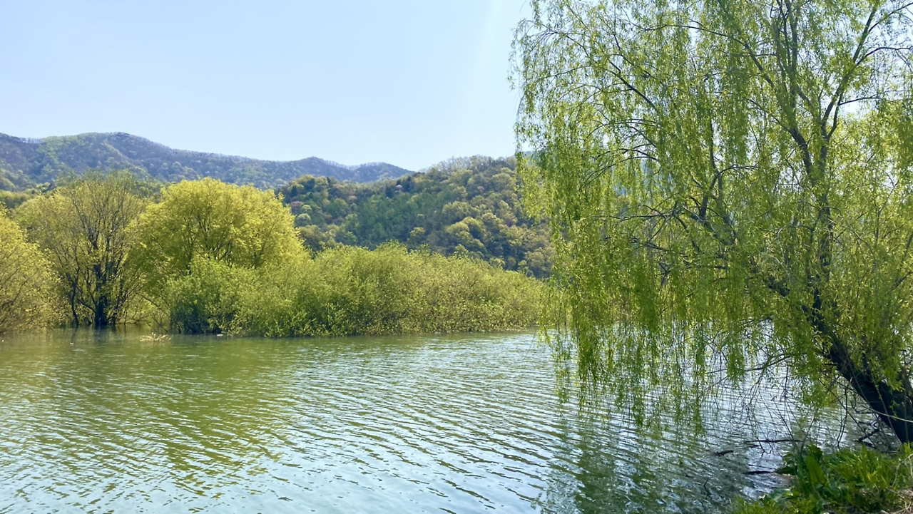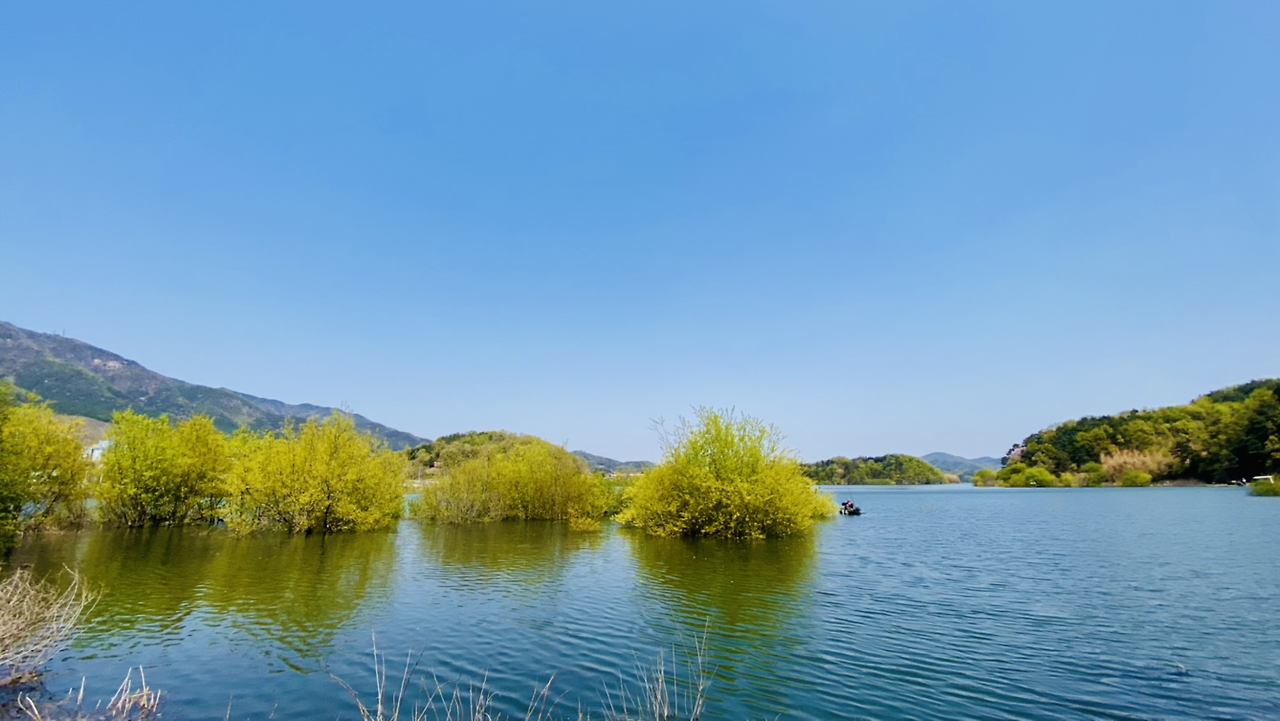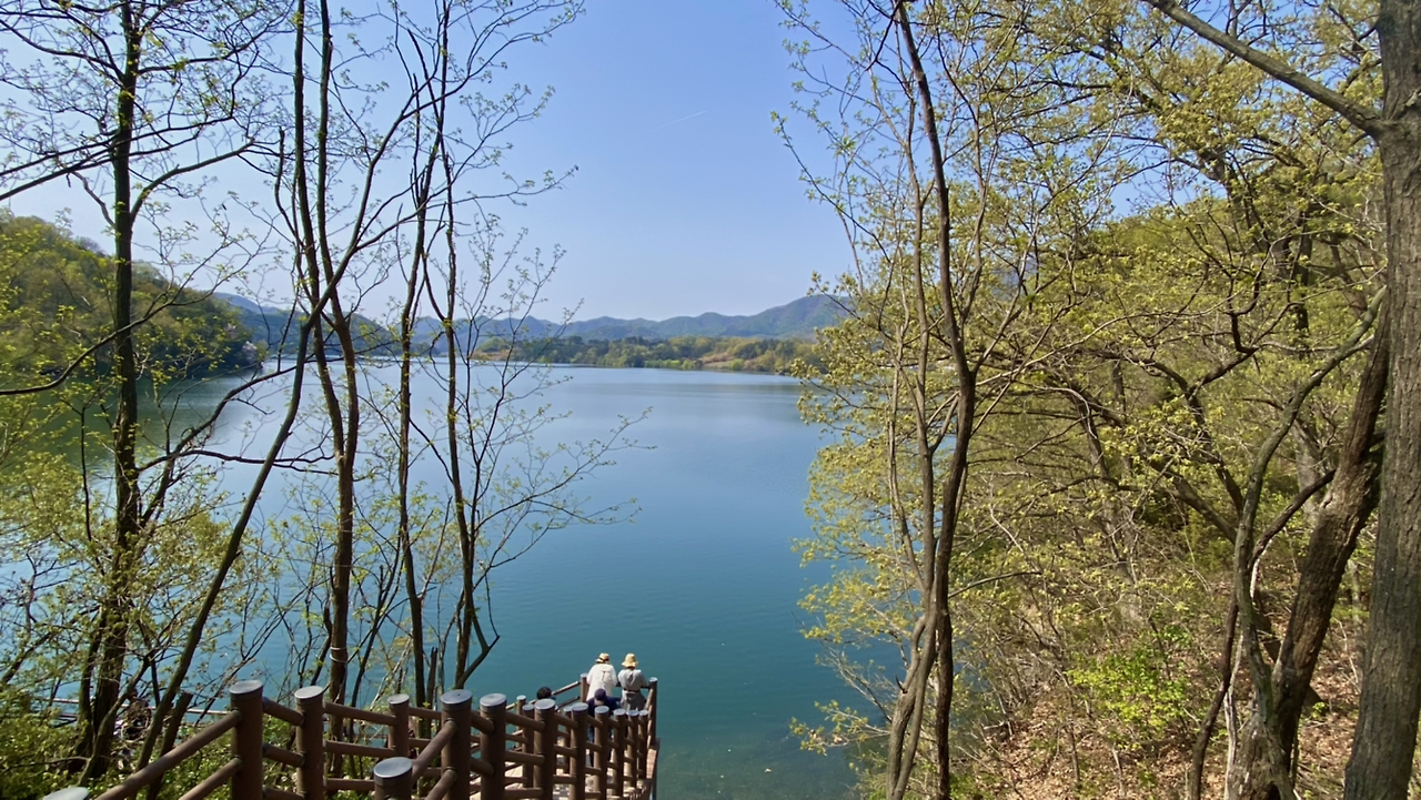 시작은 순조로웠다. 연둣빛 나뭇잎들로 뒤덮인 아름다운 둘레길이다. 호수에 투영된 나무와 강태공이 보였다. 본래 낚시가 허용된 곳은 아니라 들었지만 조용하게 낚싯대를 드리운 풍광은 보기 좋았다. 구이저수지 둘레길은 매거진 <여행하기 좋은 날>에 이미 소개한 바 있다. 호숫가 전체를 돌면 약 3시간~3시간 반 정도가 소요된다.