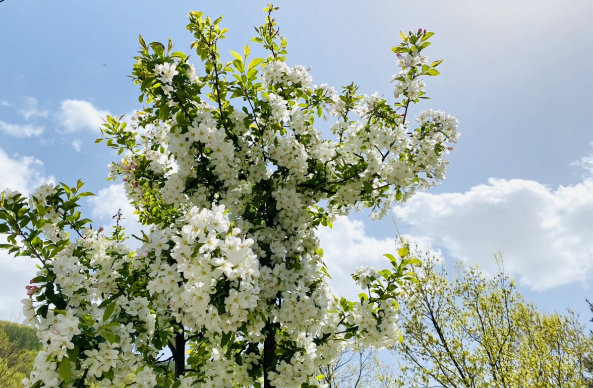 유스호텔 쪽으로 내려와 보니 화단에 밥 티 나무와 사과 꽃나무가 만발했다.