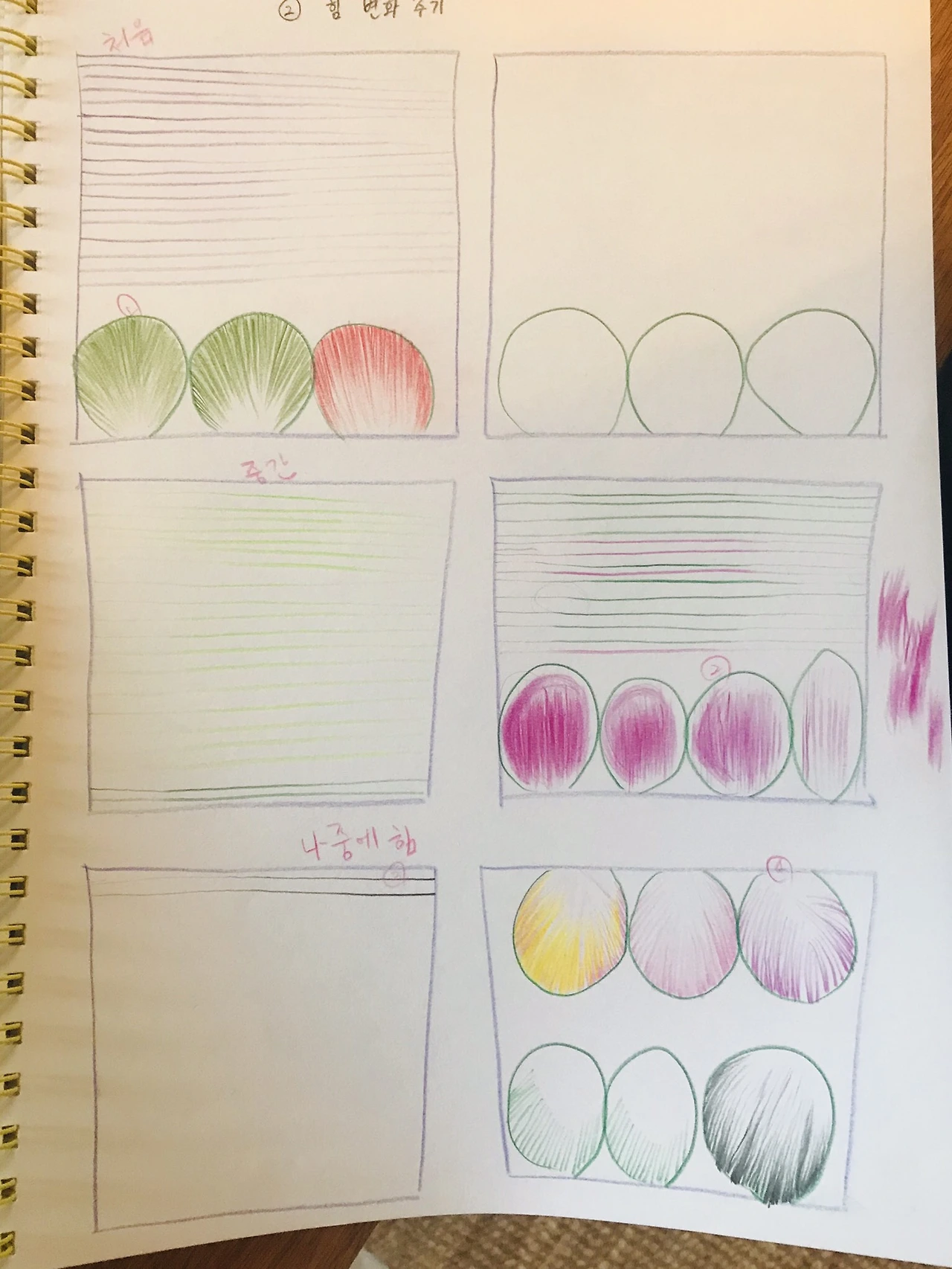 기초 드로잉과 컬러링을 가르쳐 본 적이 있다. 기초 지식이나 실력이 없던 사람이 아주 짧은 시간 안에 보는 눈이 달라지는 것을 지켜보았다. 동료들에게는 동아리 활동으로 했다. 특별한 지인의 경우 5회로 끝내는 강좌였다. 아래 그림과 같다.