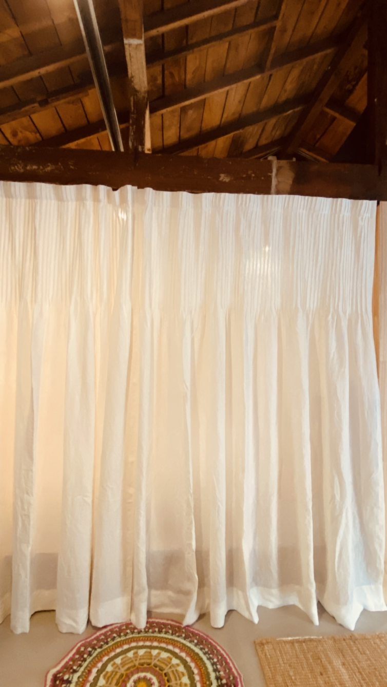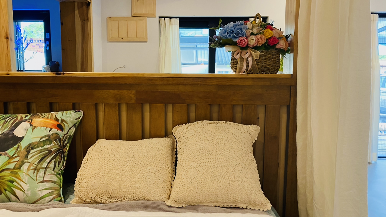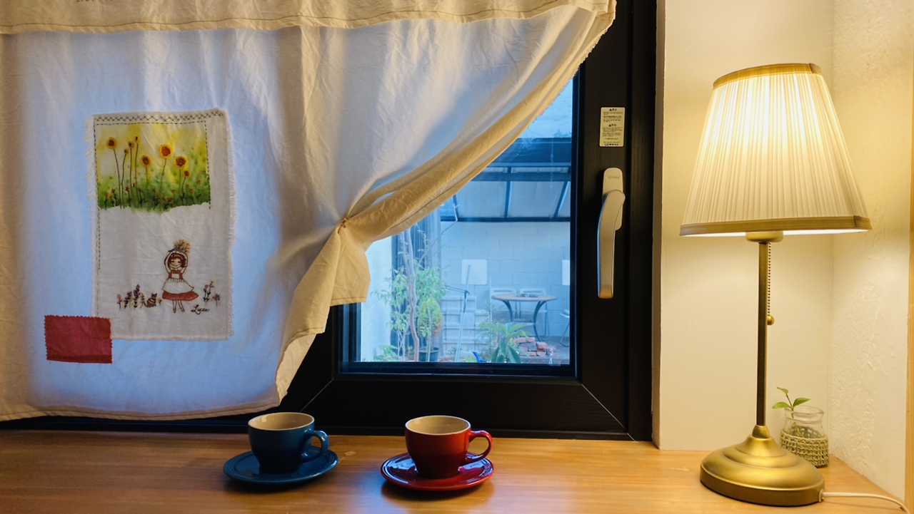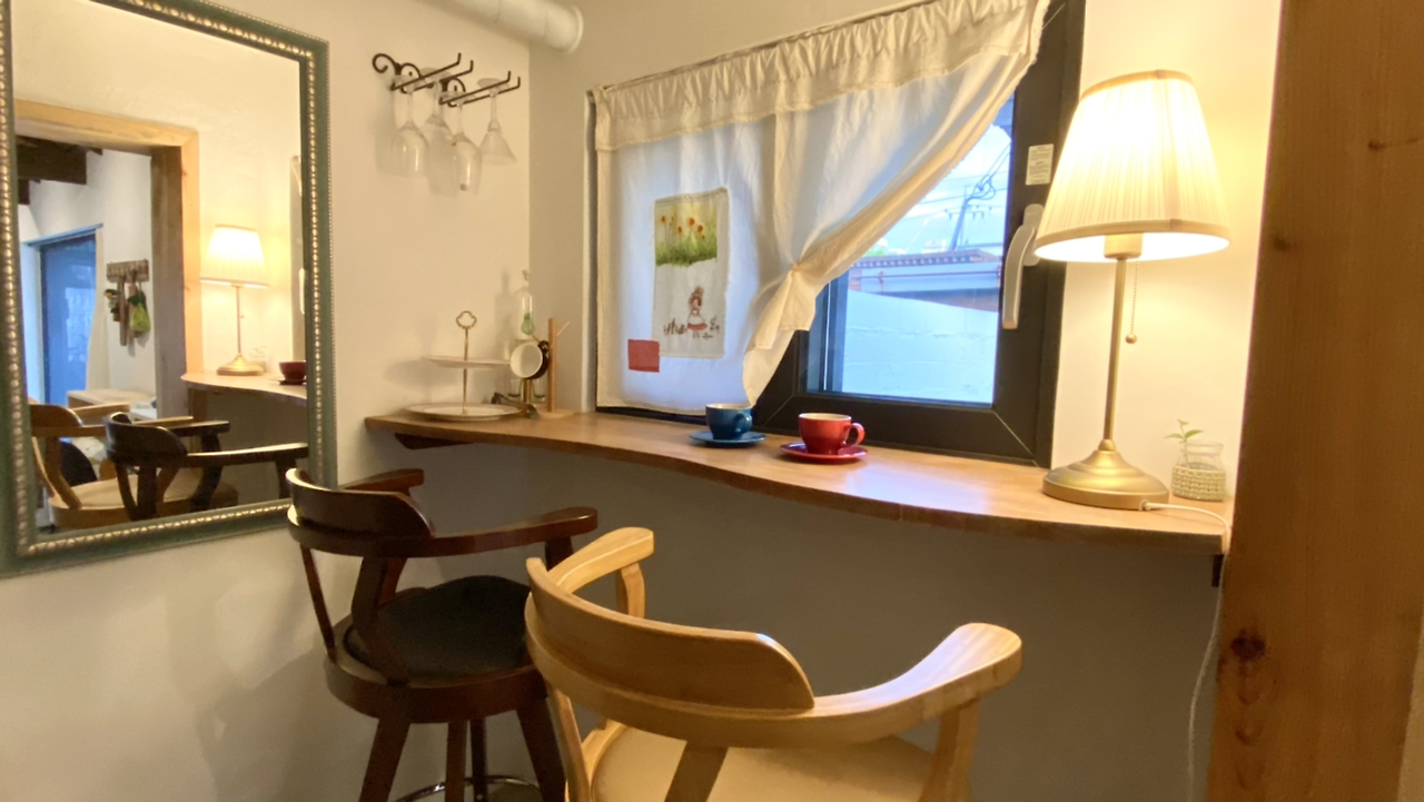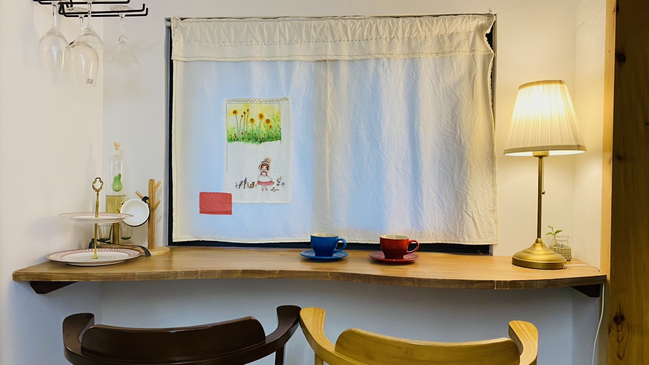 차나 와인을 마시며 마당을 내다보는 곳이다. 바 의자 두 개 놓이는 공간이다. 이곳의 창문은 커튼 주문을 하지 않았다. 마침 내가 전에 만들었던 커튼이 있어 이용하니 안성맞춤이다.