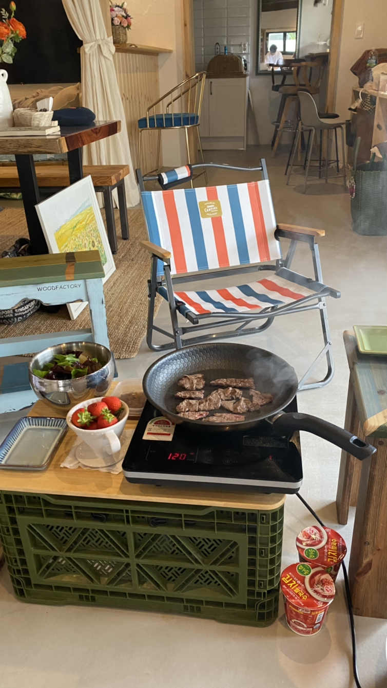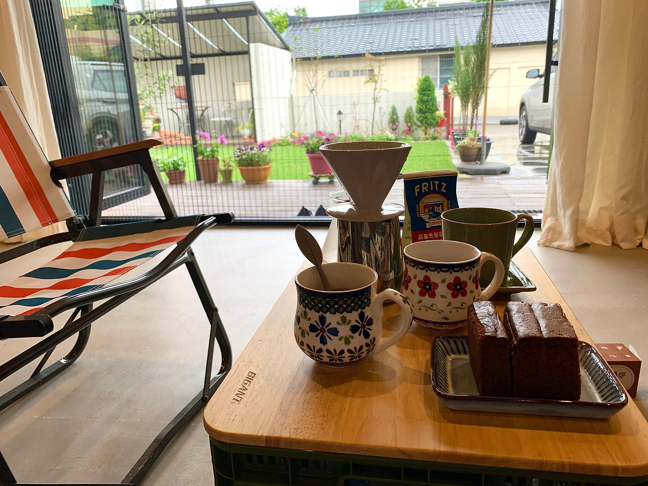 "애들아, 커피 내려줄게. 여기 캠핑 의자 앉아봐. 좋지. 너는 커피 안 마셔? 그럼 홍차 마실래?" 하고 말하면서 캠핑 박스와 의자들을 옮겼다.