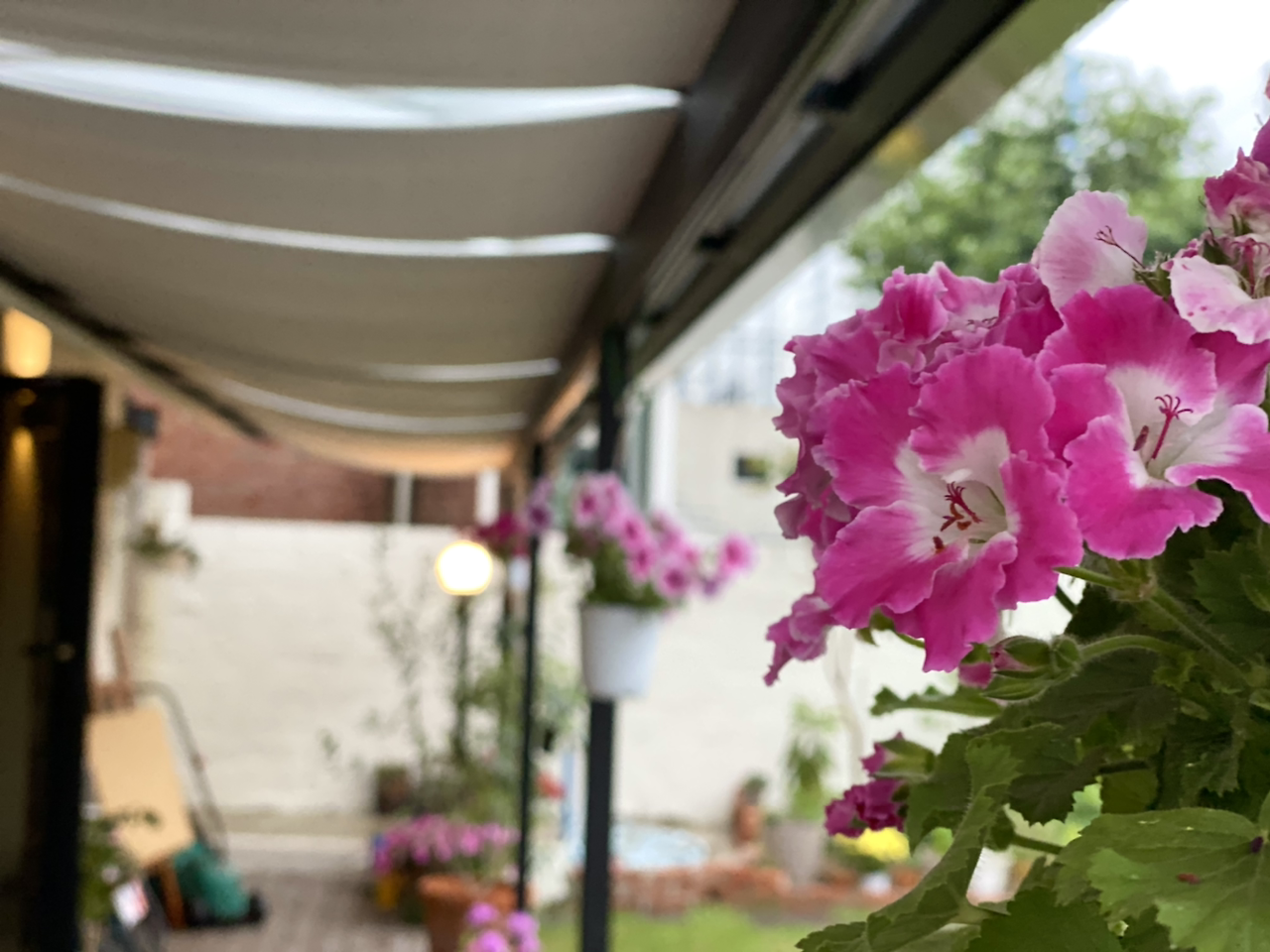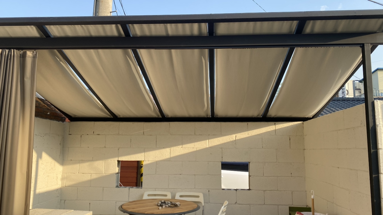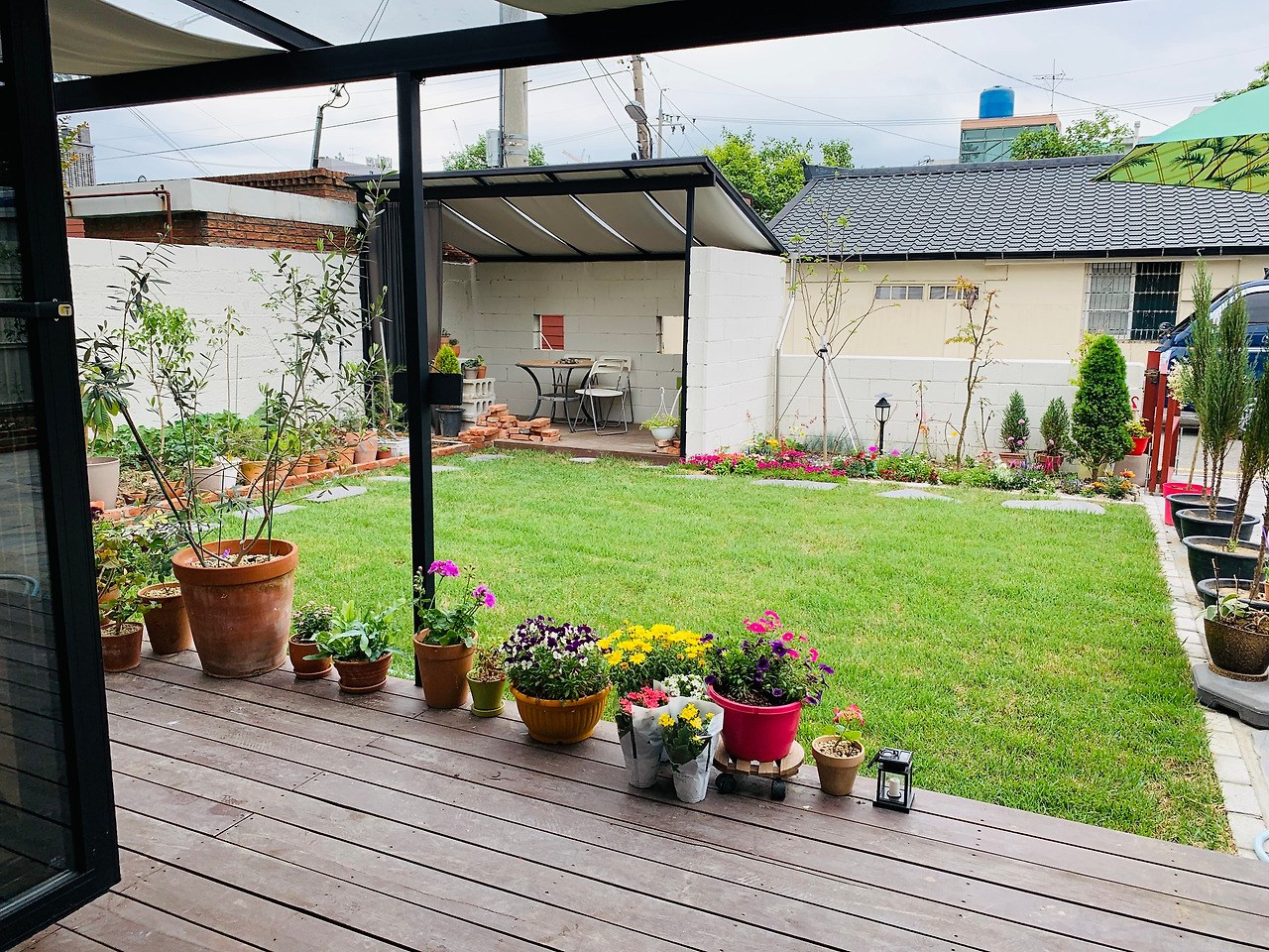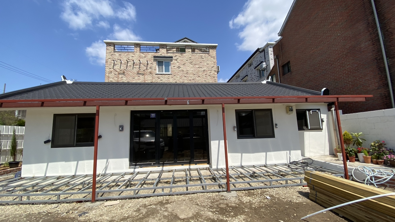 낮은 한옥 지붕이기 때문에 차양에 대해서 많이 고민했다. 어닝이 한 방법이다.
