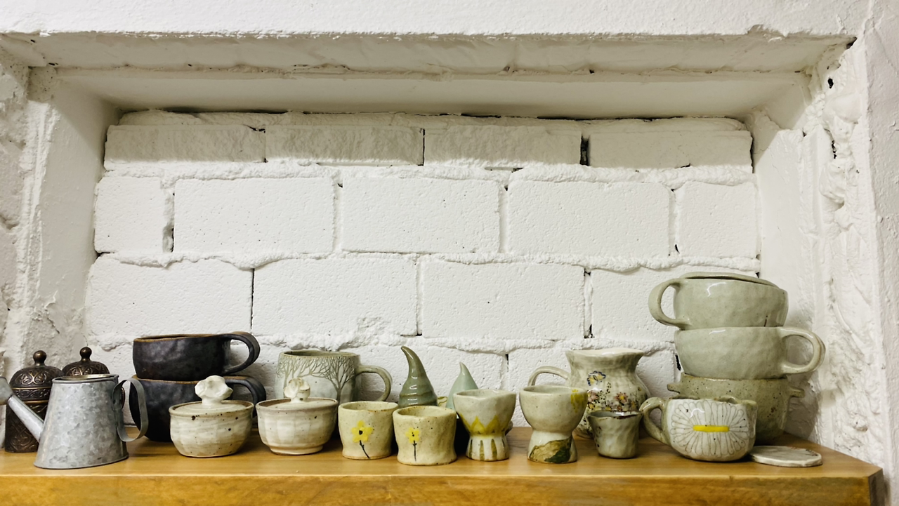 "제가 만든 도자기들인데요. 왼편의 뚜껑 있는 찻잔은 수제품을 산 것이네요."