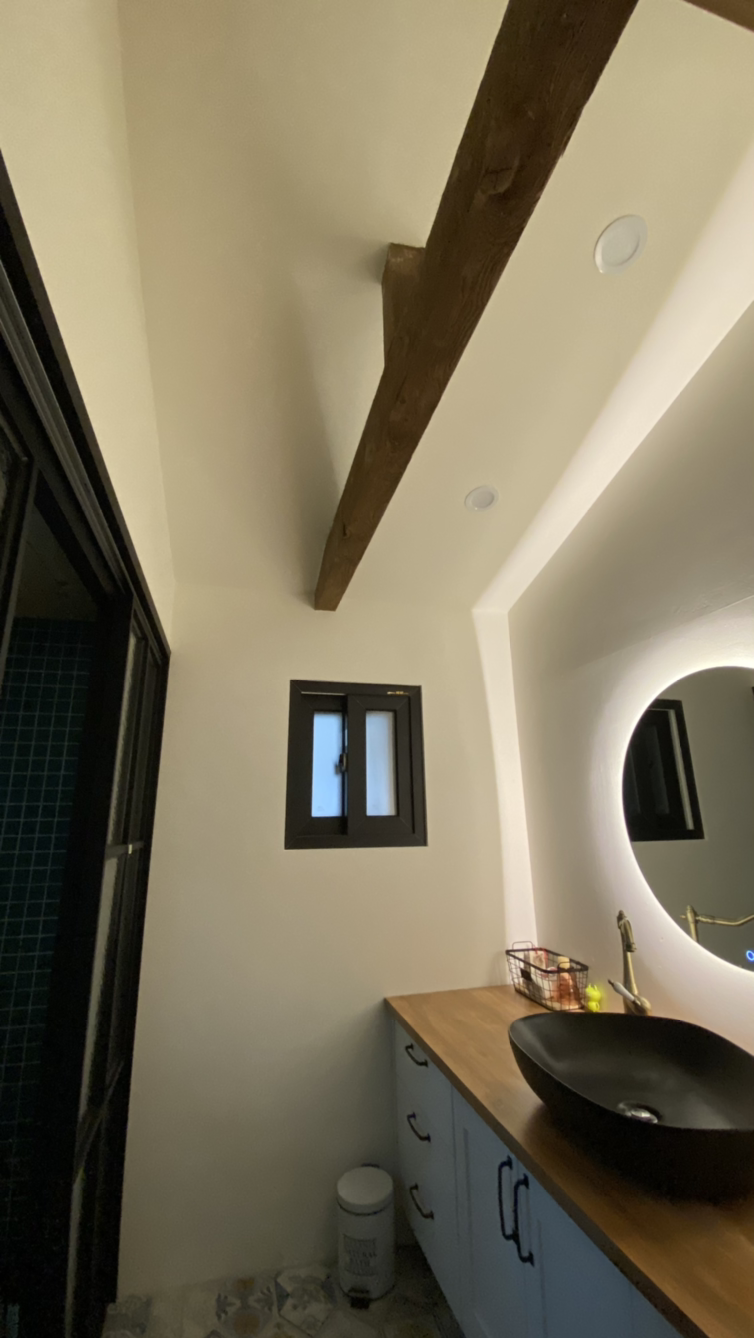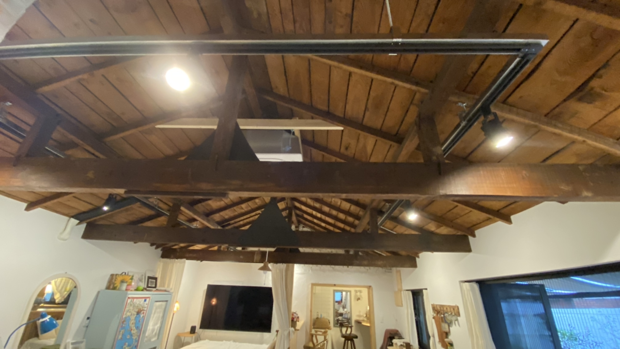 "천정의 나무를 깨끗하게 하기 위해서 벤자민 무어 페인트 중에 투명 스테인을 칠했어요. 지저분한 상태의 나무가 정돈된 차분한 본연의 색으로 변했지요?"
