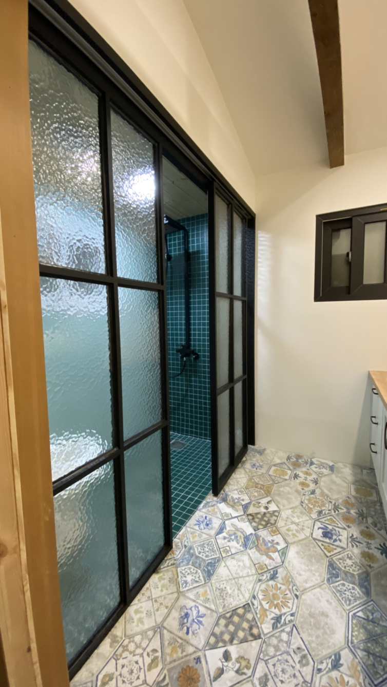"화장실의 경우 천장의 전기 선들 때문에 노출에 어려움이 있어 천장 마감을 흰색으로 했어요. 욕실 부분은 S 대표가 아주 깔끔하게 진두지휘했지요. 사실 S 대표가 솜씨가 있는 분이에요. 천장에 한 줄 남겨 둔 나무가 멋스럽죠? 화장실은 깔끔하게 마무리하는 것이 당연히 백배 나아서 만족해요. 아무래도 습기가 있는 곳이기 때문이니까요. 샤워실 초록 타일이 예쁘다고요? 네. 거기 '어은 터널' 지나면 '신영상사'라고 있어요. 그곳에 타일 종류가 많더군요."