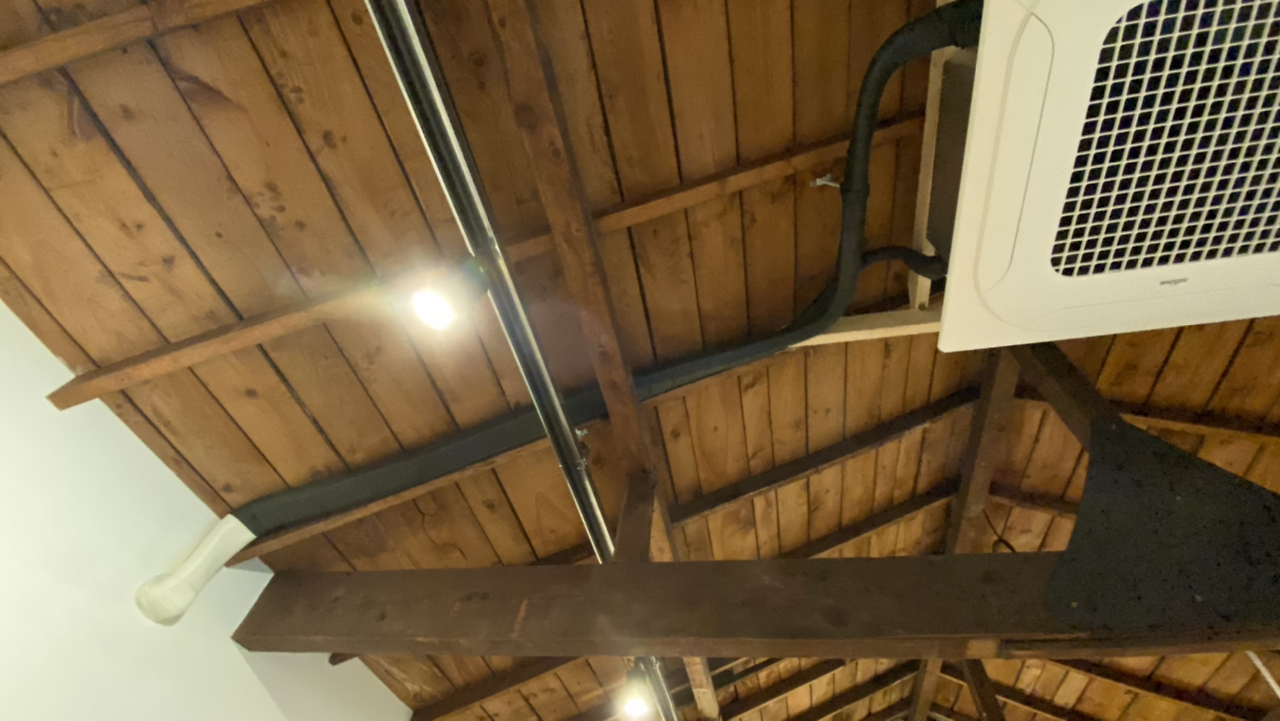 "저기 에어컨 배관 보세요. 본래 일을 깔끔하게 하시는 에어컨 사장님이신데요. 그렇다고 해도 인테리어에는 주인의 요구가 중요하잖아요. 무거운 에어컨이 잘 지탱하기 위해서 윗부분을 잘 보강하고 에어컨을 달았어요."