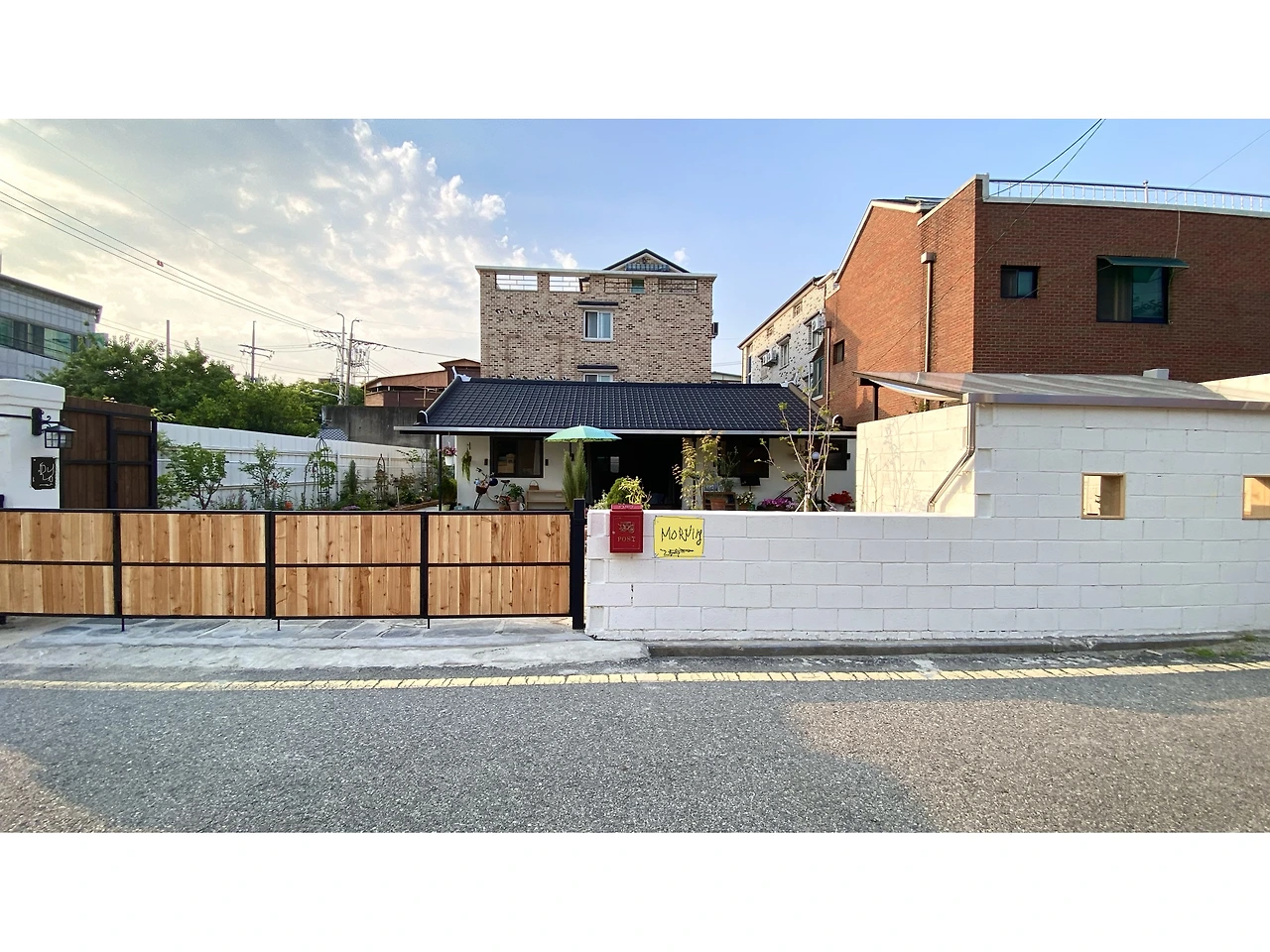 빨간 우체통을 달았다. 딸들에게 주소를 알려줘야겠다. 담벼락이 오른쪽 썬룸으로 이어진다. 이전 공방에서 사용하던 것이다.