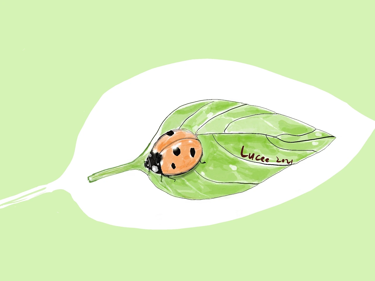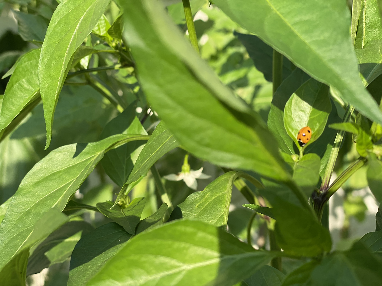 공간 모닝의 텃밭에 행운의 상징이라는 무당벌레가 왔다. 바로 고춧잎 위에 앉아 있다. 깜찍하게 생긴 무당벌레의 등에 있는 점의 수를 세어 본다. 칠성 무당벌레다.