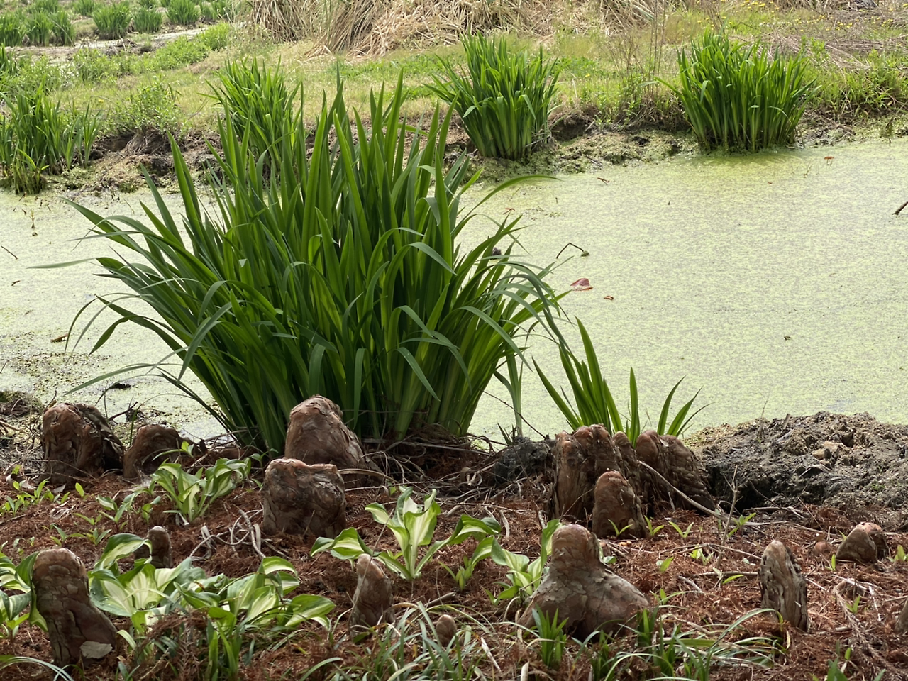 습지에서 낙우송은 뿌리가 숨을 쉴 수 있게 하기 위해 기근을 지표 밖으로 뻗어 올린다고 합니다. 여기저기 기근(호흡근)들이 볼록볼록 한데요. 지금 쯤 더 솟아 있으리라 여깁니다.