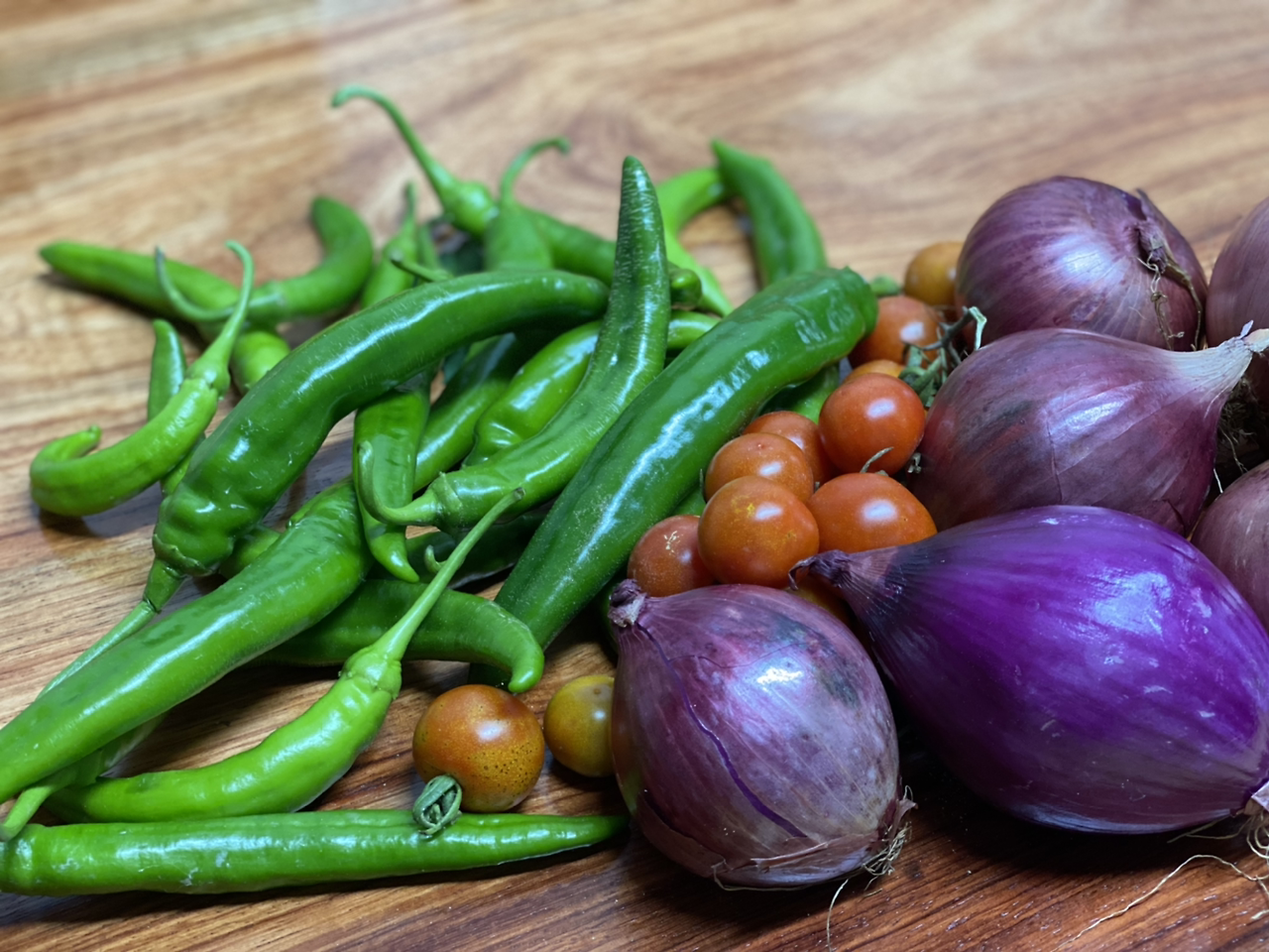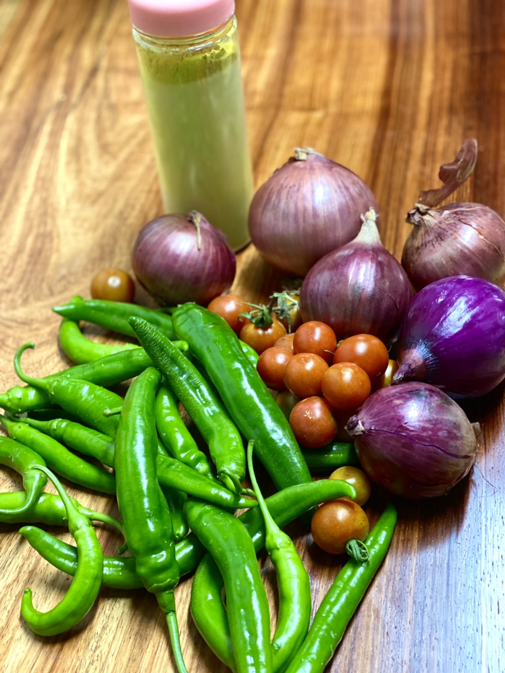 줄리아가 준 자색 양파와 강황가루 그리고 나의 정원의 미니 텃밭의 고추와 방울토마토를 펼쳐 놓았다. 부유해진 느낌이다.