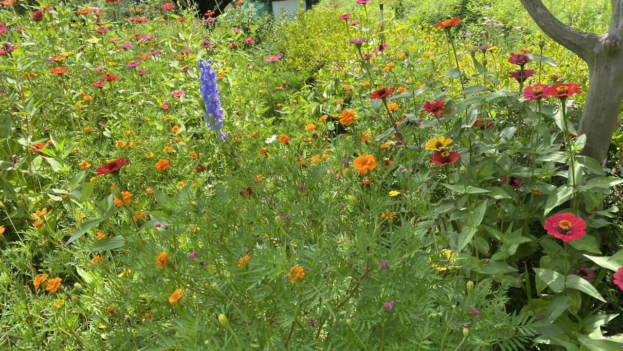매리골드와 백일홍 꽃밭에 프록스가 여왕처럼 유일한 파랑이다.