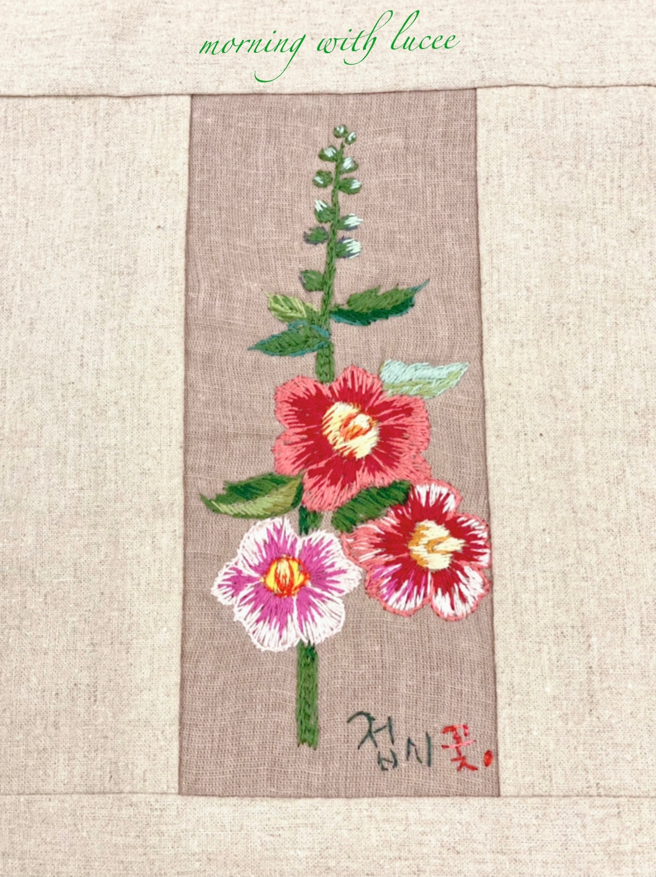 접시꽃 수를 놓아 보았다. 다음엔 접시꽃 그림을 그려야겠다.