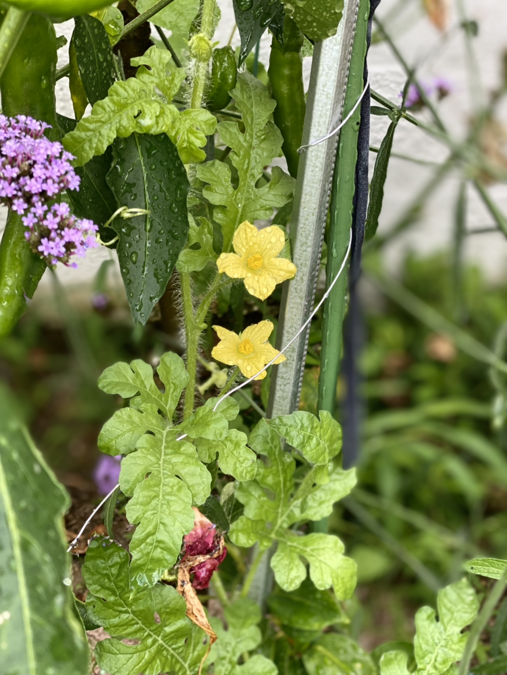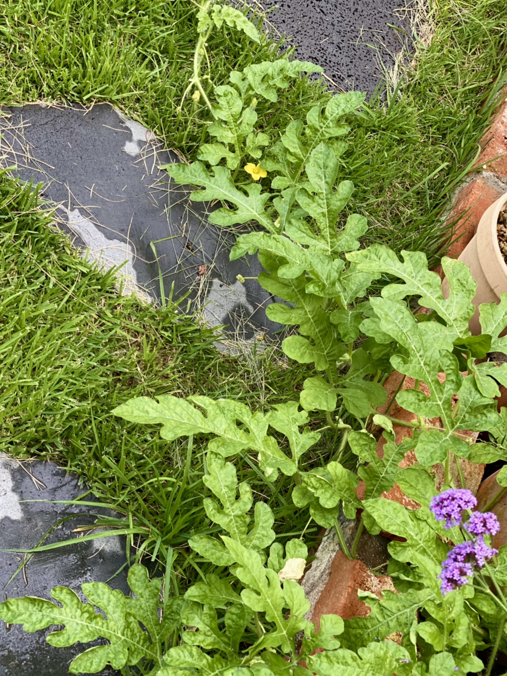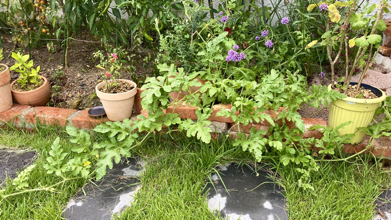 지난 4월 이른 수박을 먹고 씨앗을 두 알 심었는데 덩굴만 무럭무럭 자란다. 그래서 잎을 잘랐는데도 무성하다.