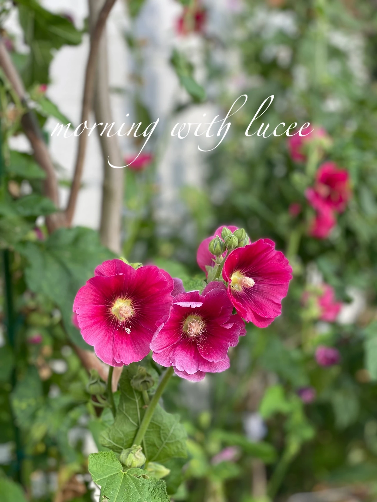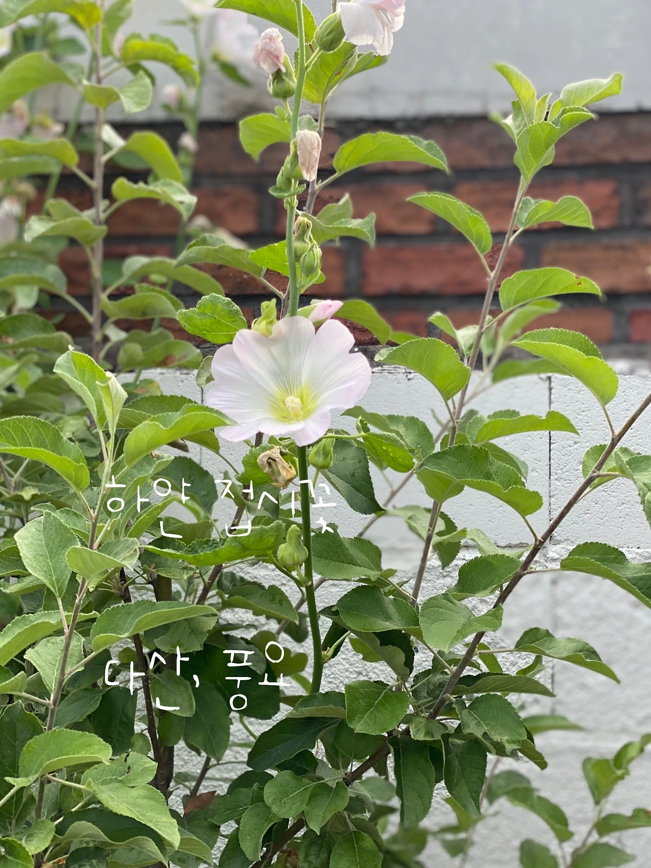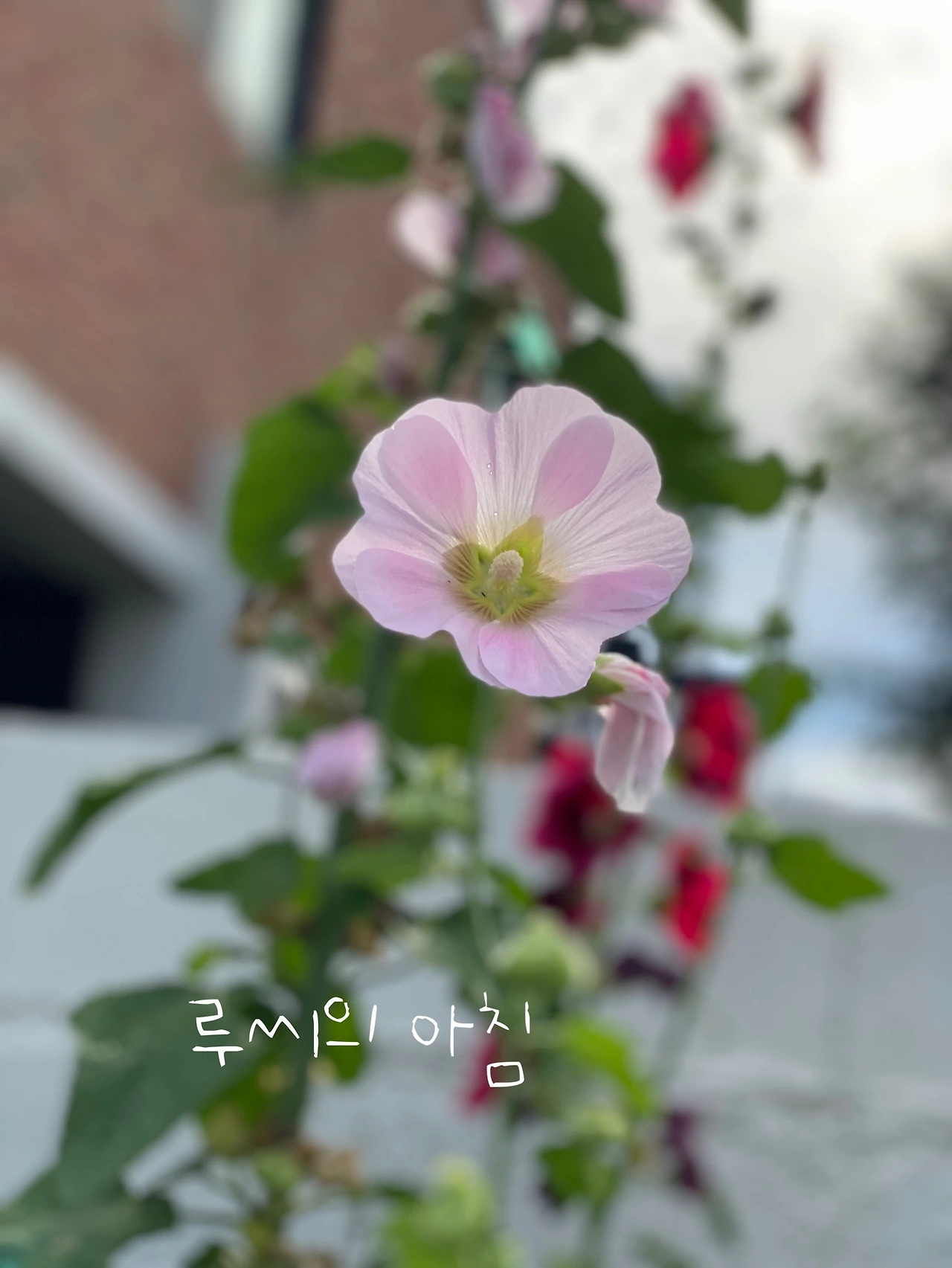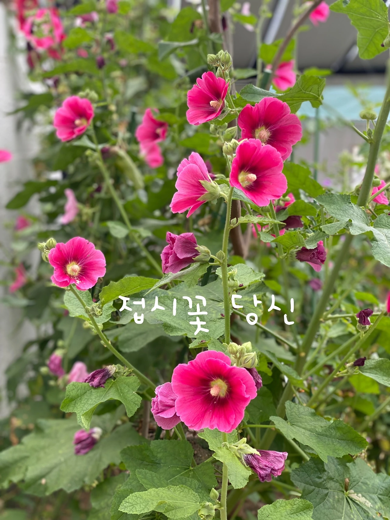 <루씨의 아침> 공방 배롱나무 옆에는 접시꽃이 담장보다 높게 무리 지어 솟아있다. 지난번 한 지인은 이 꽃들을 무궁화라고 했다. 의외로 사람들이 접시꽃을 모른다. 또 다른 지인도 접시꽃을 모르는 것을 보고 정말 놀랐다. "접시꽃 당신" 이란 도종환 시인의 시 몰라? 하고 내가 그들에게 되묻게 된다.
