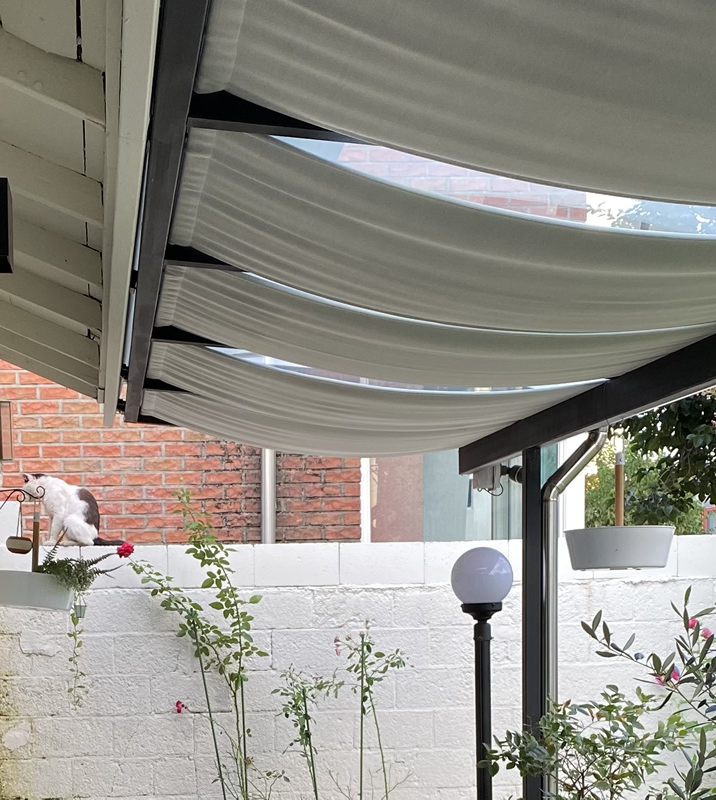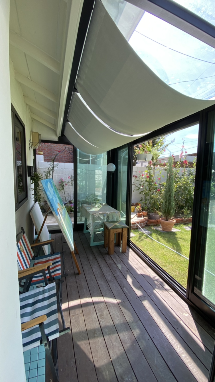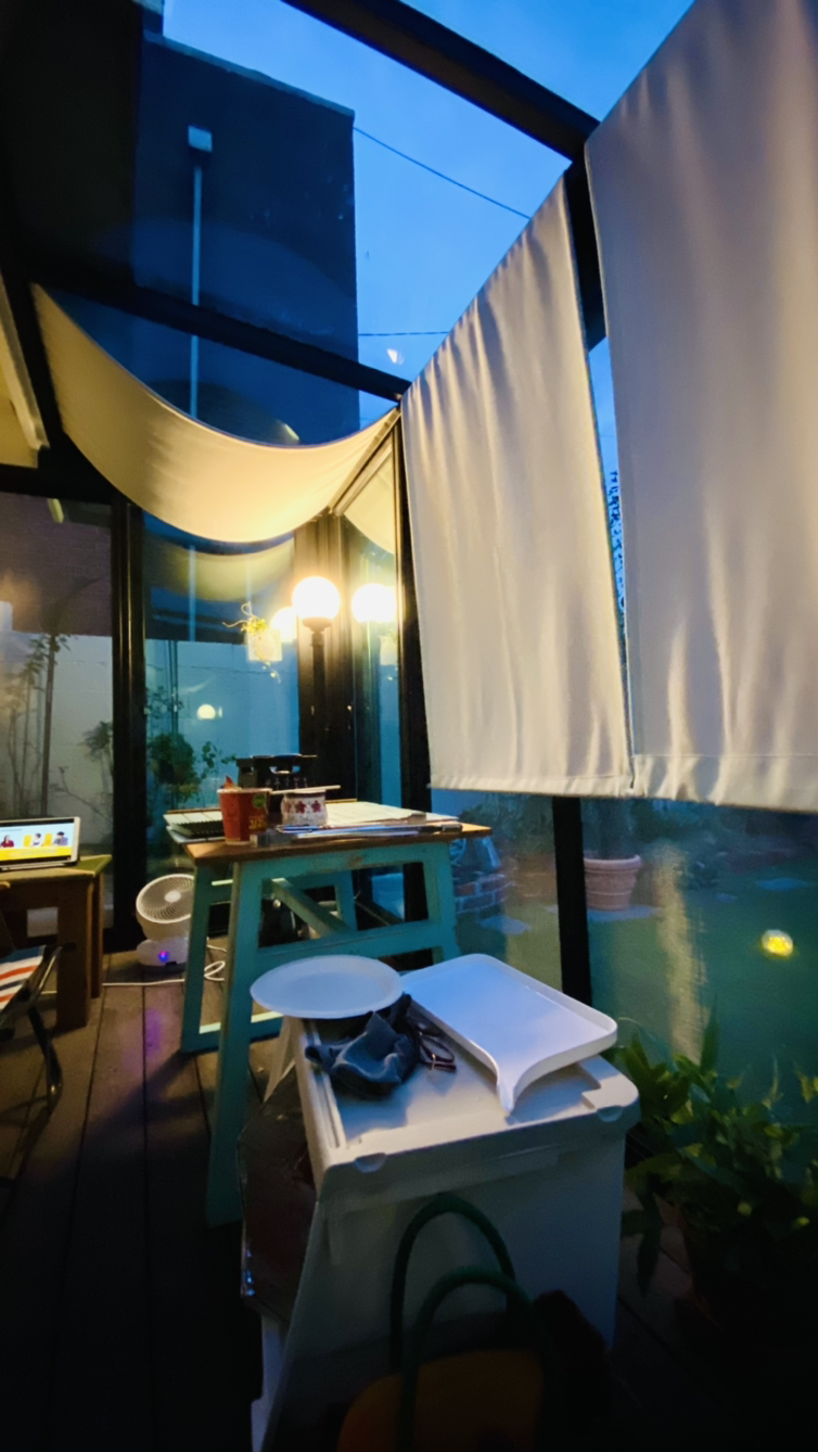 봉 커튼으로 조절했던 한쪽 면을 풀어서 내리면 길가에서 잘 보이지 않는 공간이 된다. 하늘은 보이고 앞은 일부가 가려진다.
