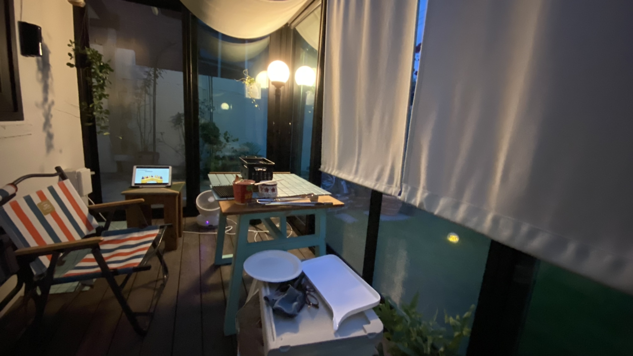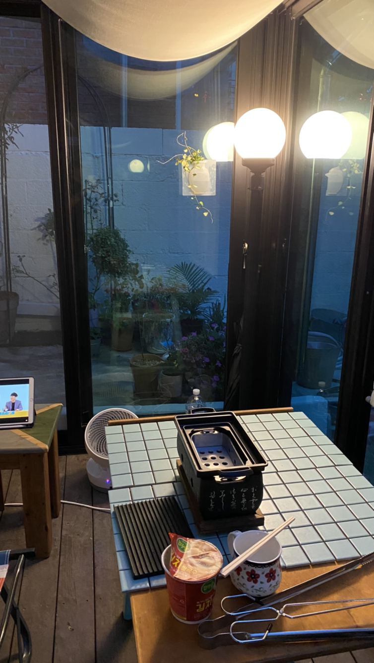 여기서 유독 나의 눈을 끈 것은 일인용 고기 불판이었다. 그래서 폭풍 검색해서 바로 주문했다. 오늘 도착했다. 혼자 캠핑을 해 본 적 없는 나는 '그리 젊은 처자가 하는데 내가 못할 이유 없지'라는 심정으로 유리 온실 쪽에 이것저것 옮겼다. 공간을 완성한 후 내내 원하던 바를 이행하게 되었다.